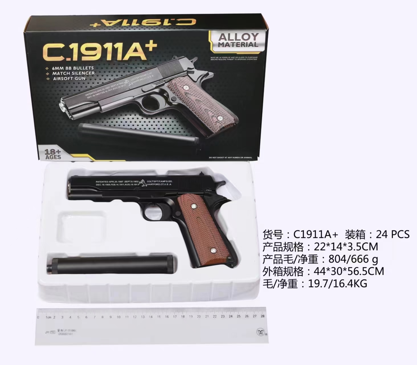 全合金(合金弹盒+消声器)图片上标有 箱规,毛净重