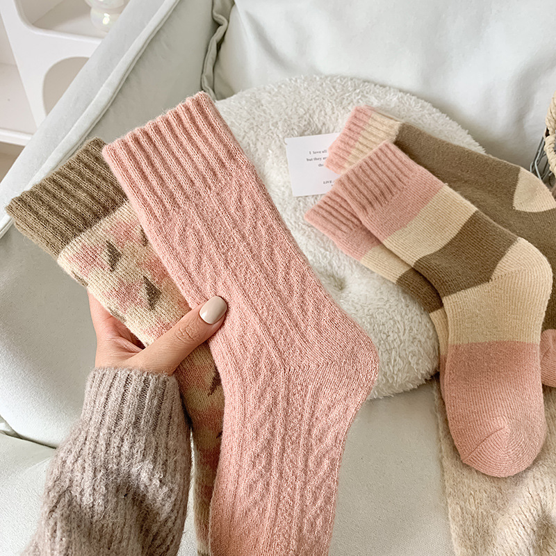 pink socks female autumn and winter mid-calf length socks tide net red style winter winter high tube plus velvet keep warm pure color terry long socks