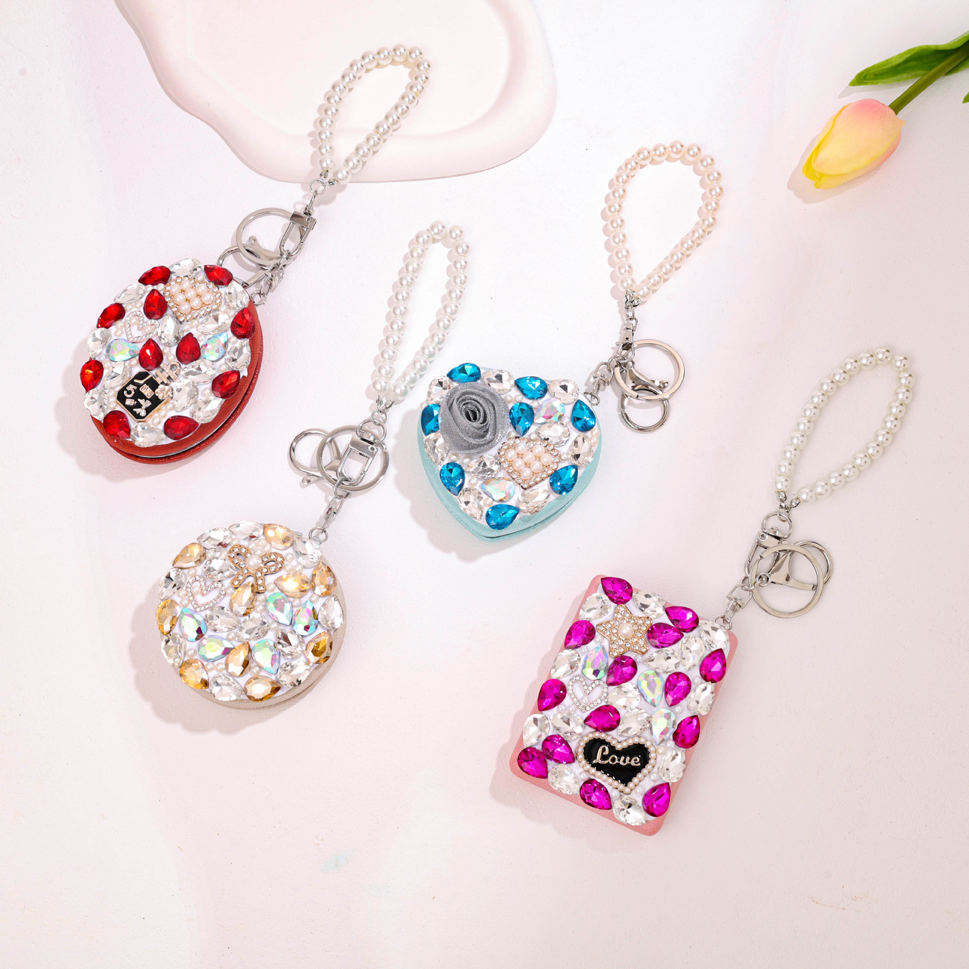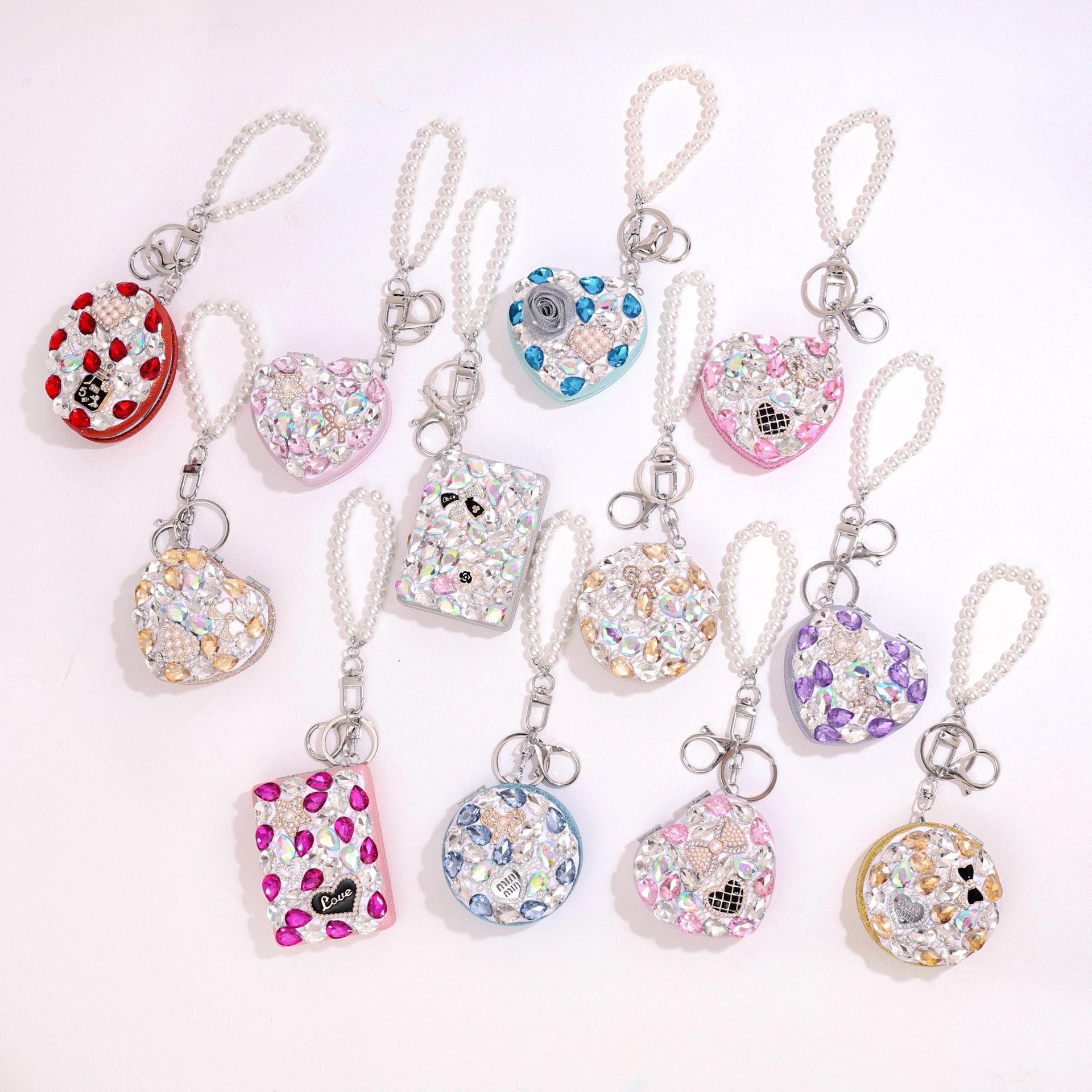 full diamond keychain pendant makeup mirror ornaments creative foldable and portable car key case ornament accessories wholesale 中文版