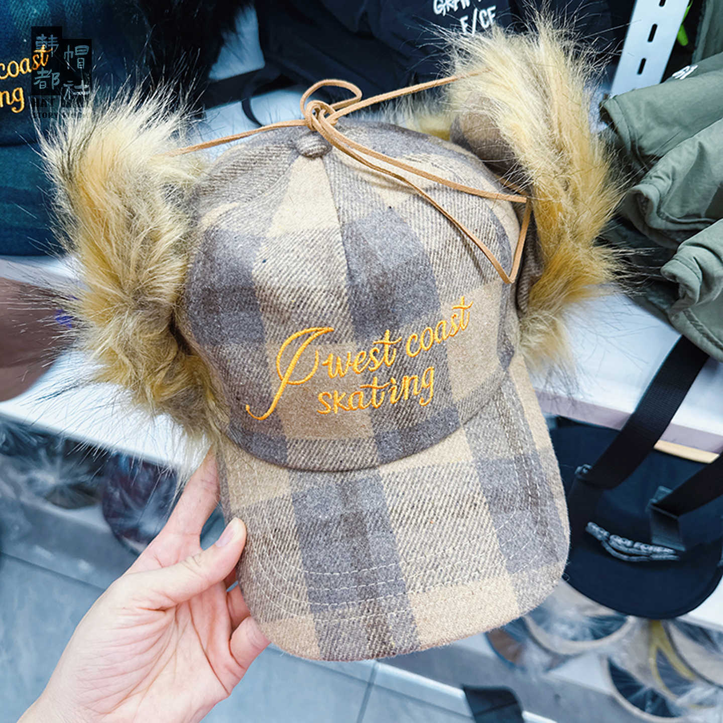letter style fur plaid baseball cap-brown