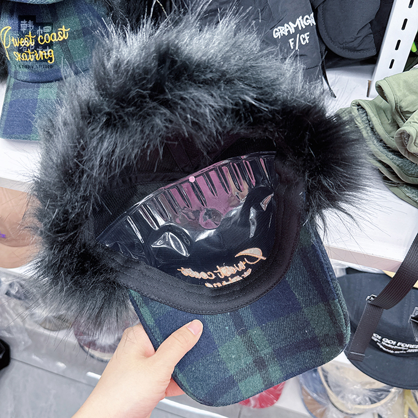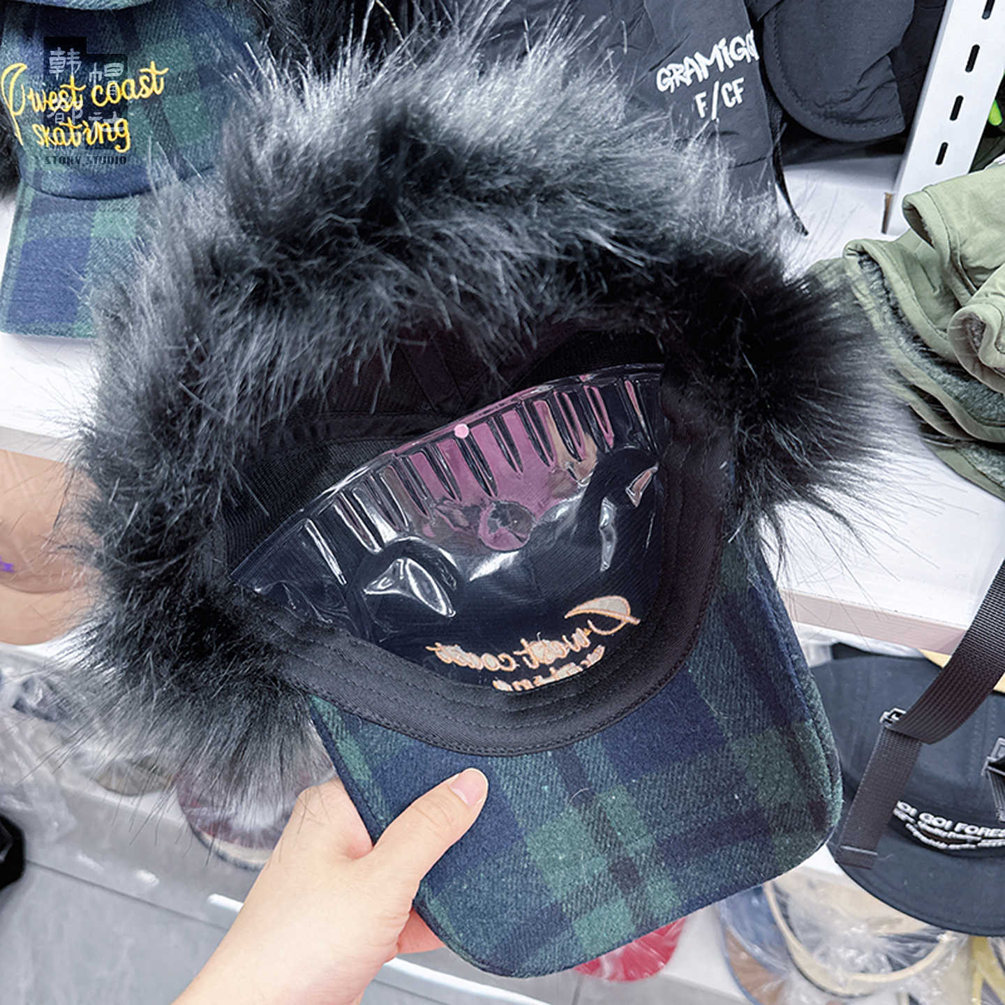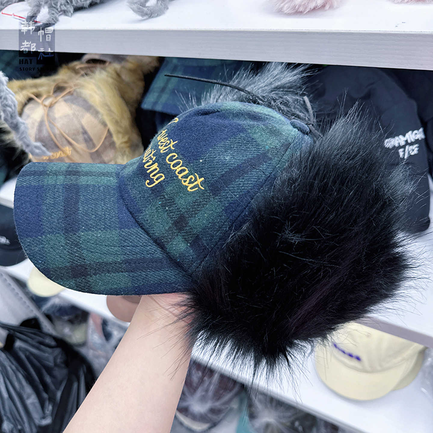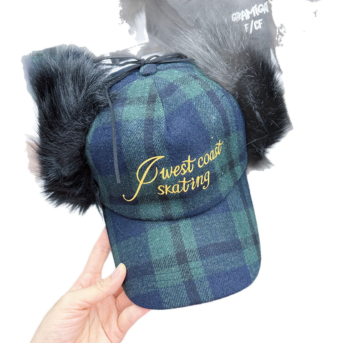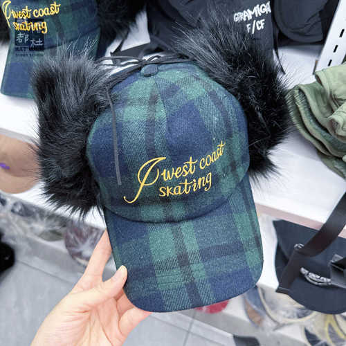 letter style fur plaid baseball cap-blue