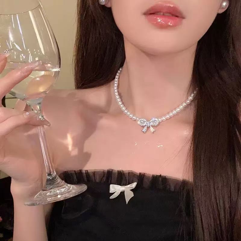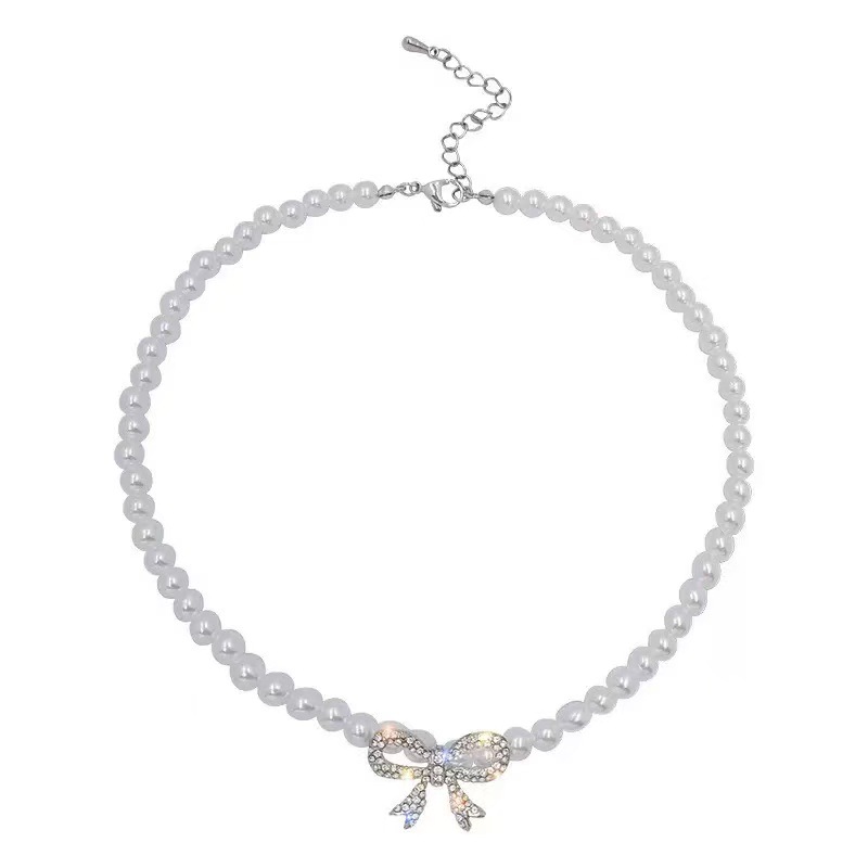 glass pearl necklace bow pendant