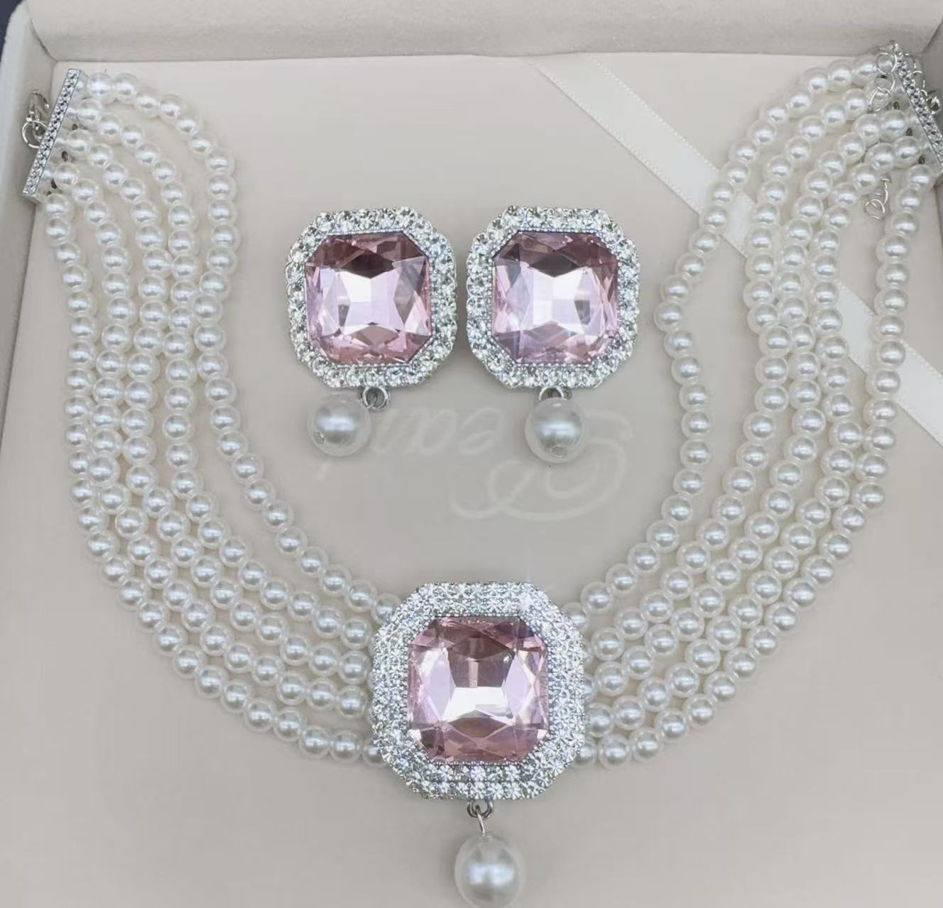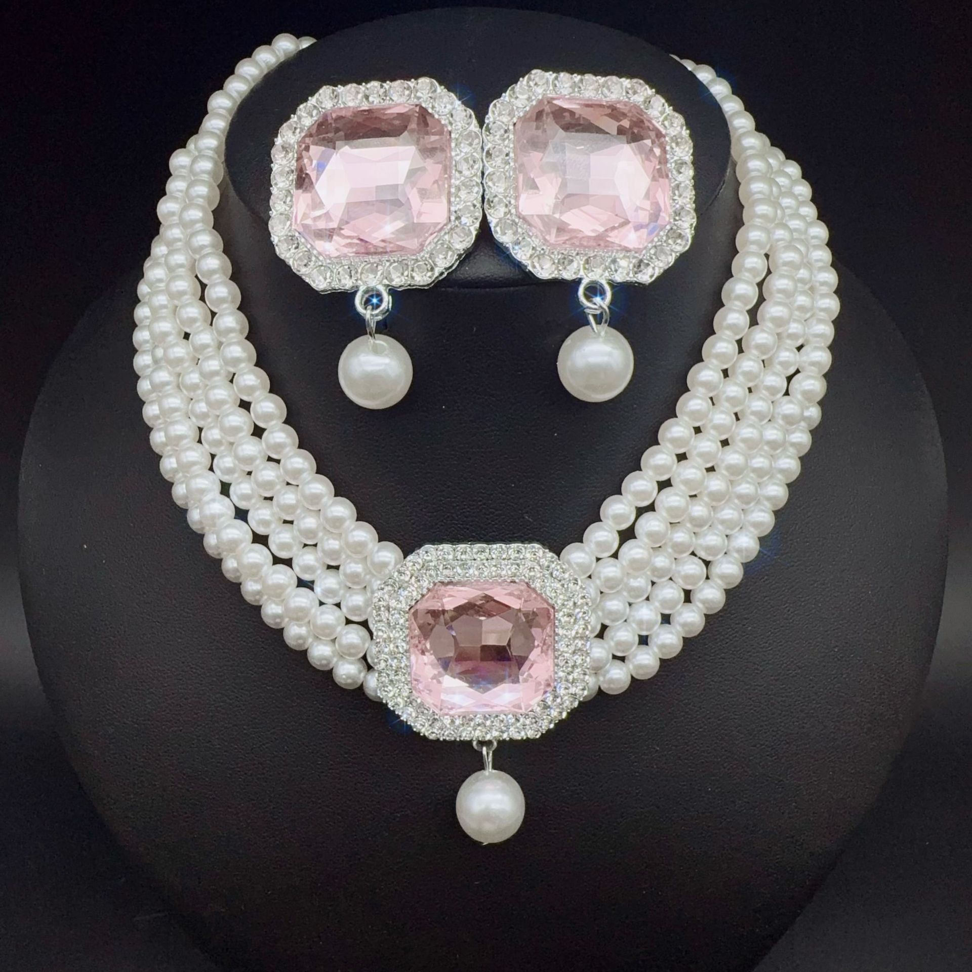 pink square pendant necklace auricular needle two-piece set