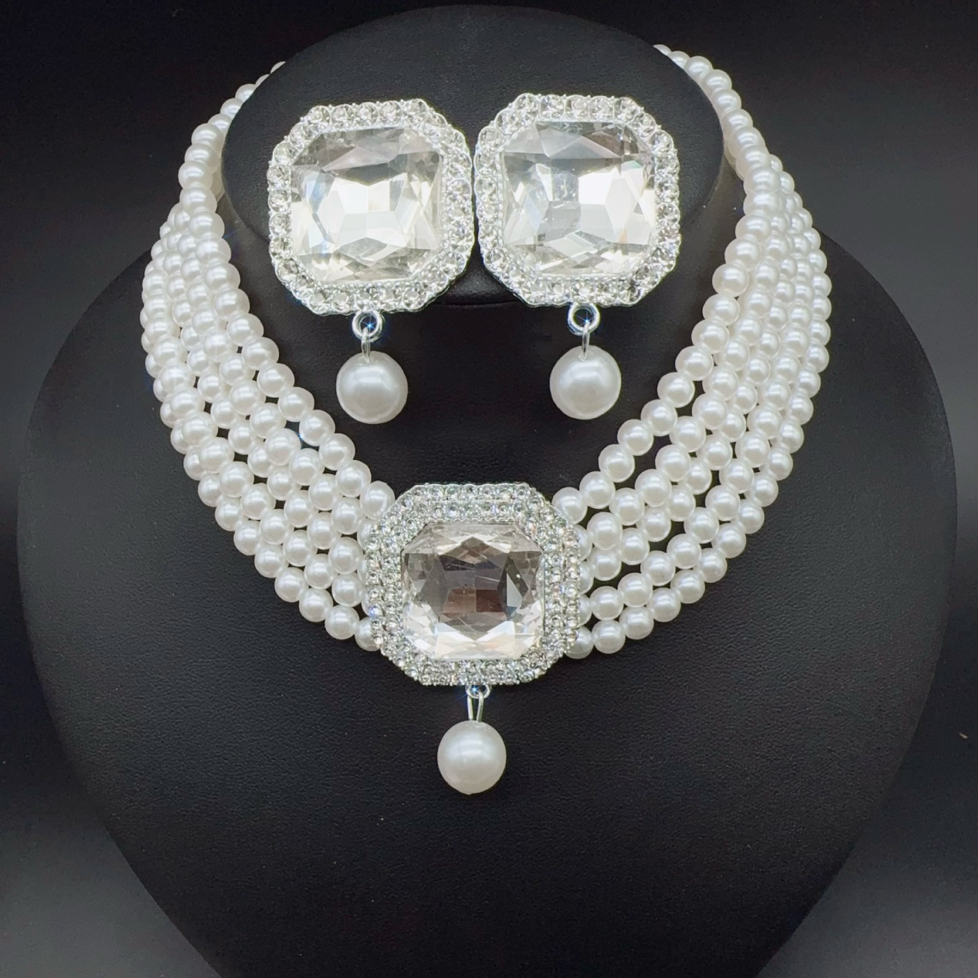 white square pendant necklace auricular needle two-piece set