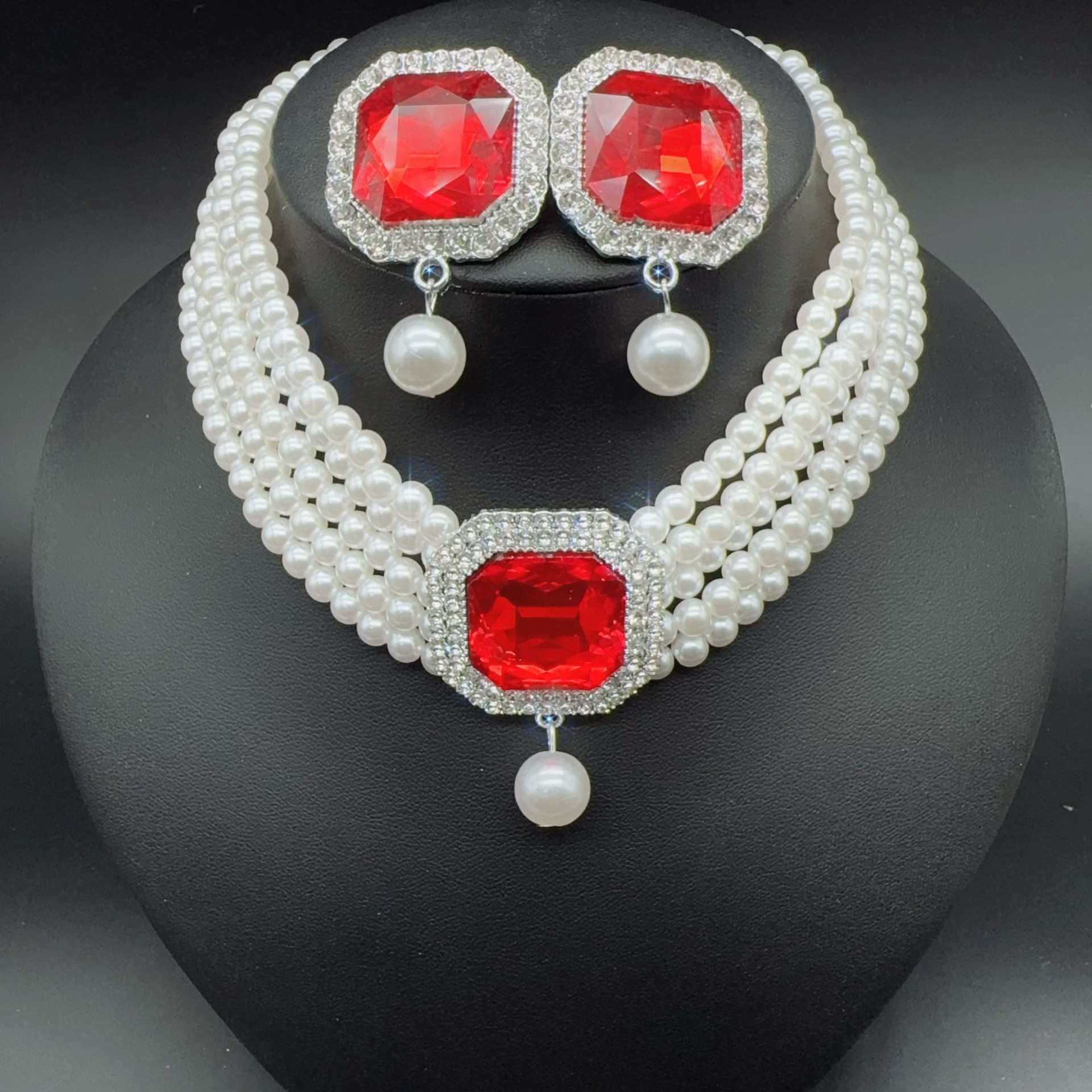 red square pendant necklace auricular needle two-piece set