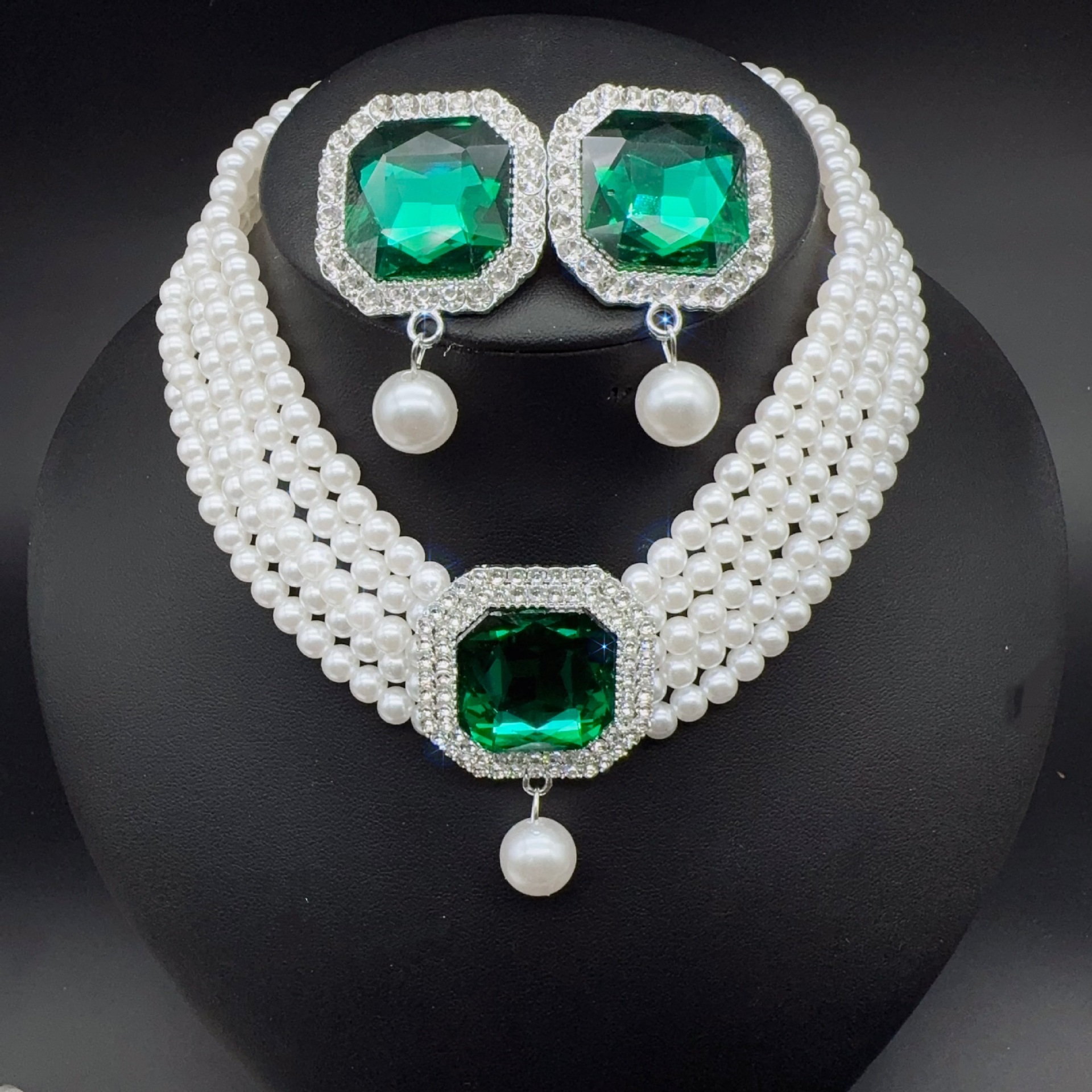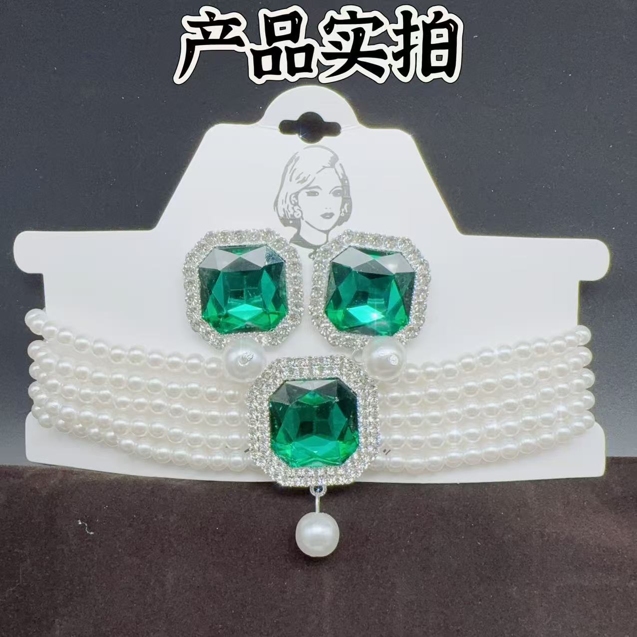 green square pendant necklace auricular needle two-piece set