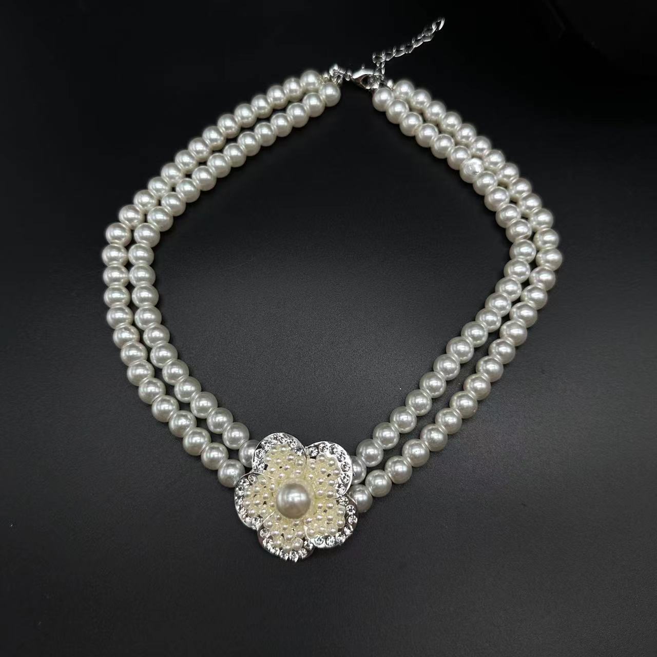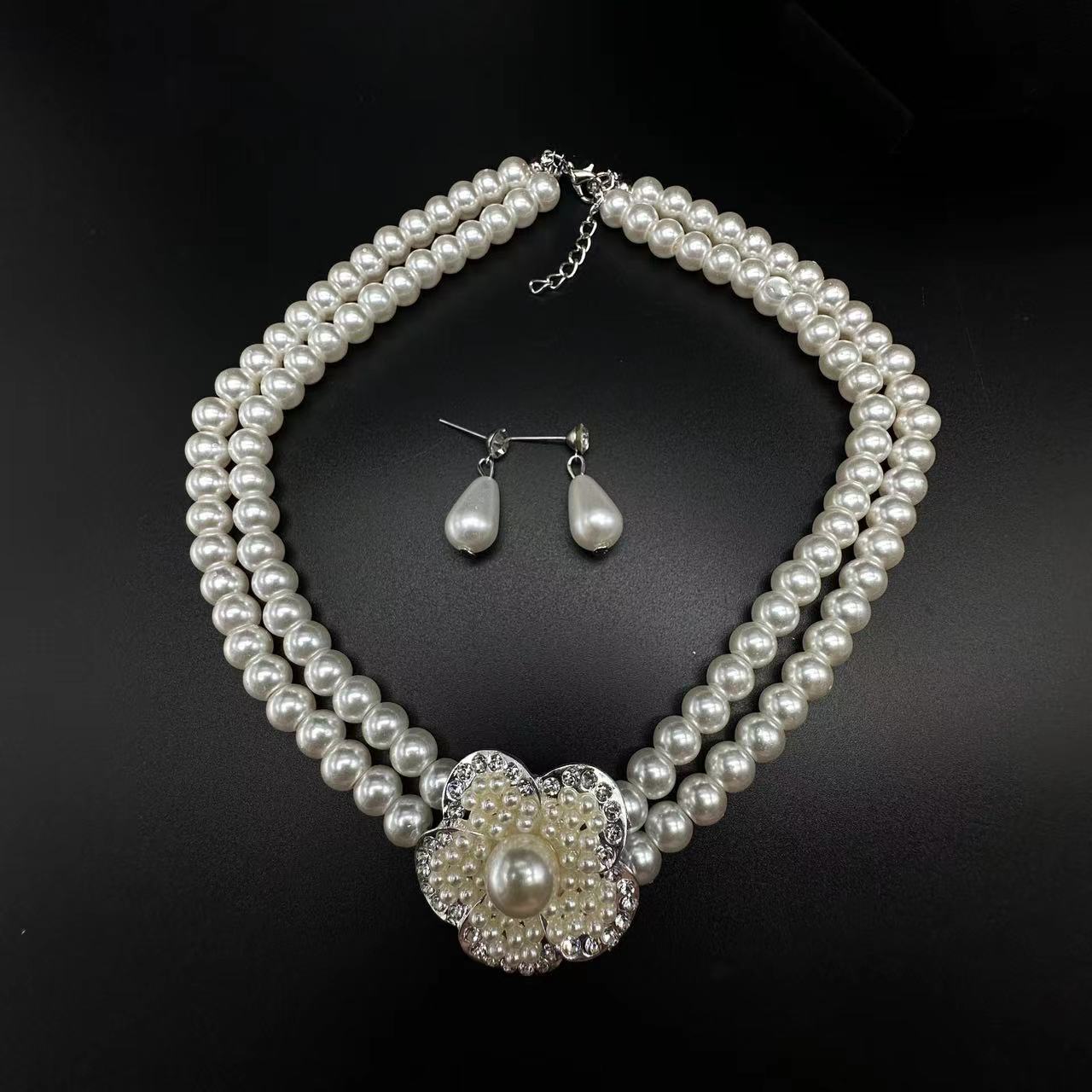 pearl necklace flower pendant auricular needle two-piece set