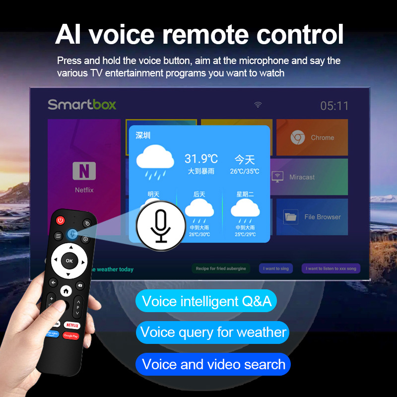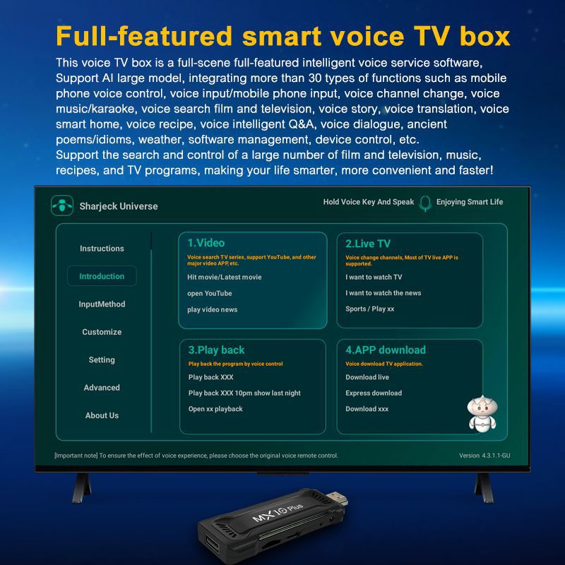 5、产品包装标配包括:机顶盒+电源+遥控器+说明书。
