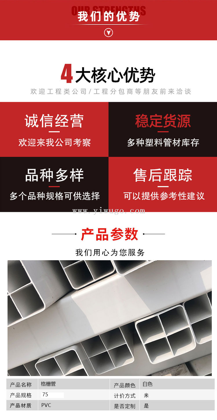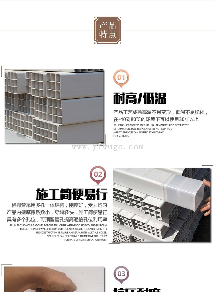PVC通信格栅管单孔四孔九孔五孔六孔,高强度抗压,包邮促销!核心卖点:耐用防腐蚀,轻松布线。解决用户痛点:告别线路混乱,提升通信效率。品牌通过ISO认证,品质可靠。情感共鸣:选择我们,享受便捷生活,省心省力。