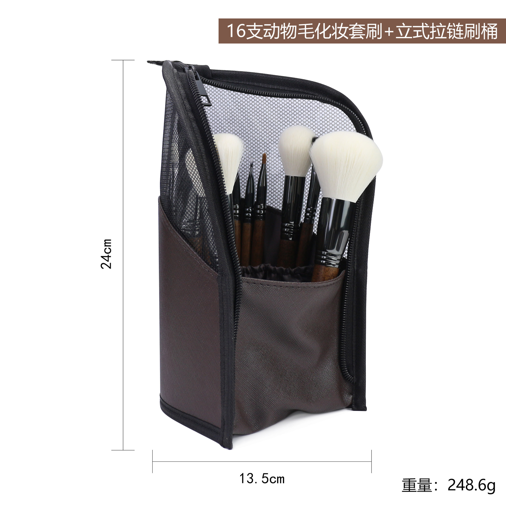 16 pcs animal hair makeup brush with vertical zipper brush bucket