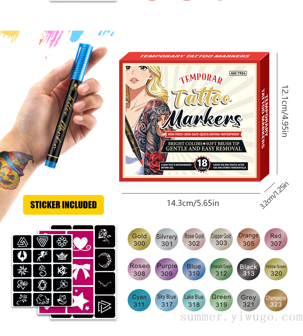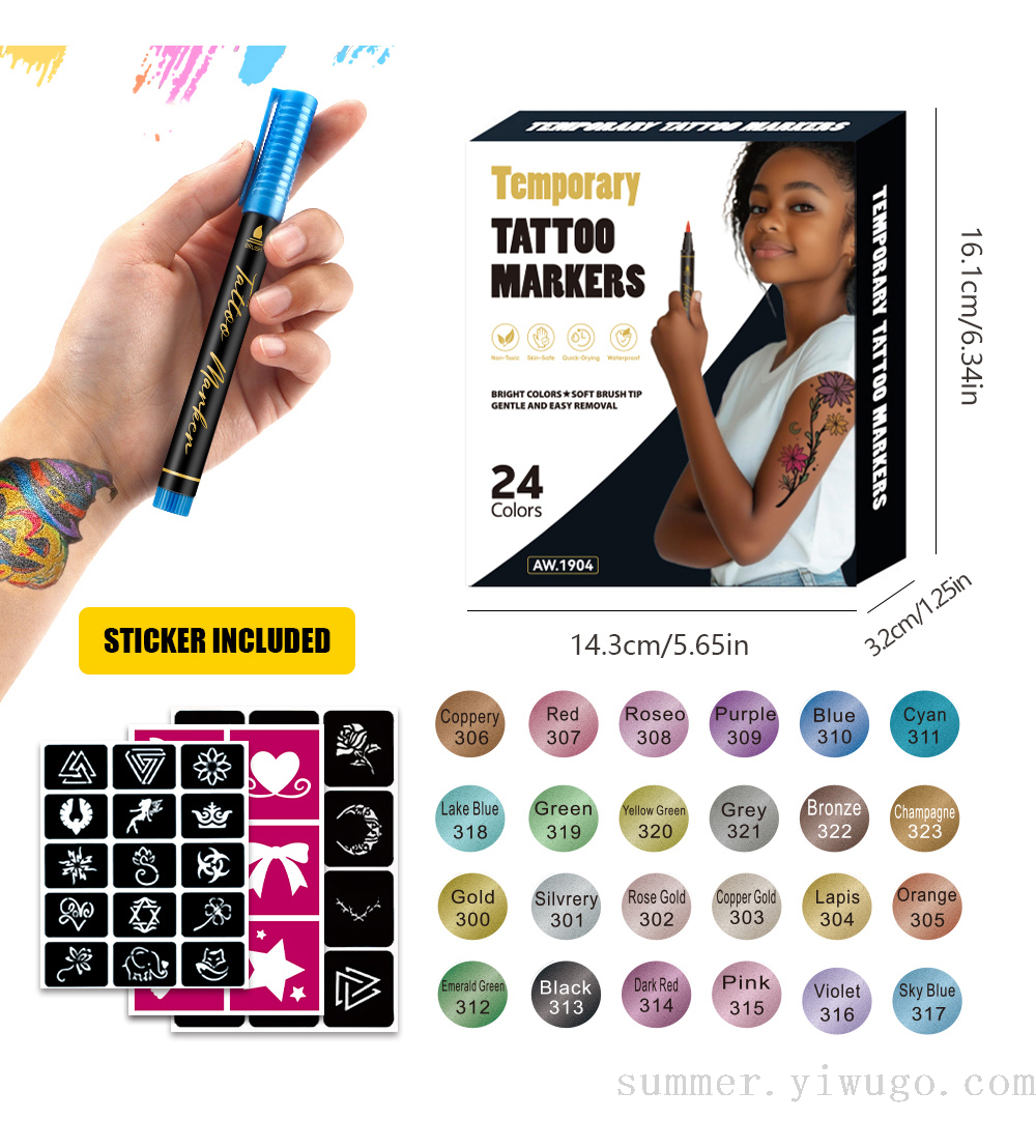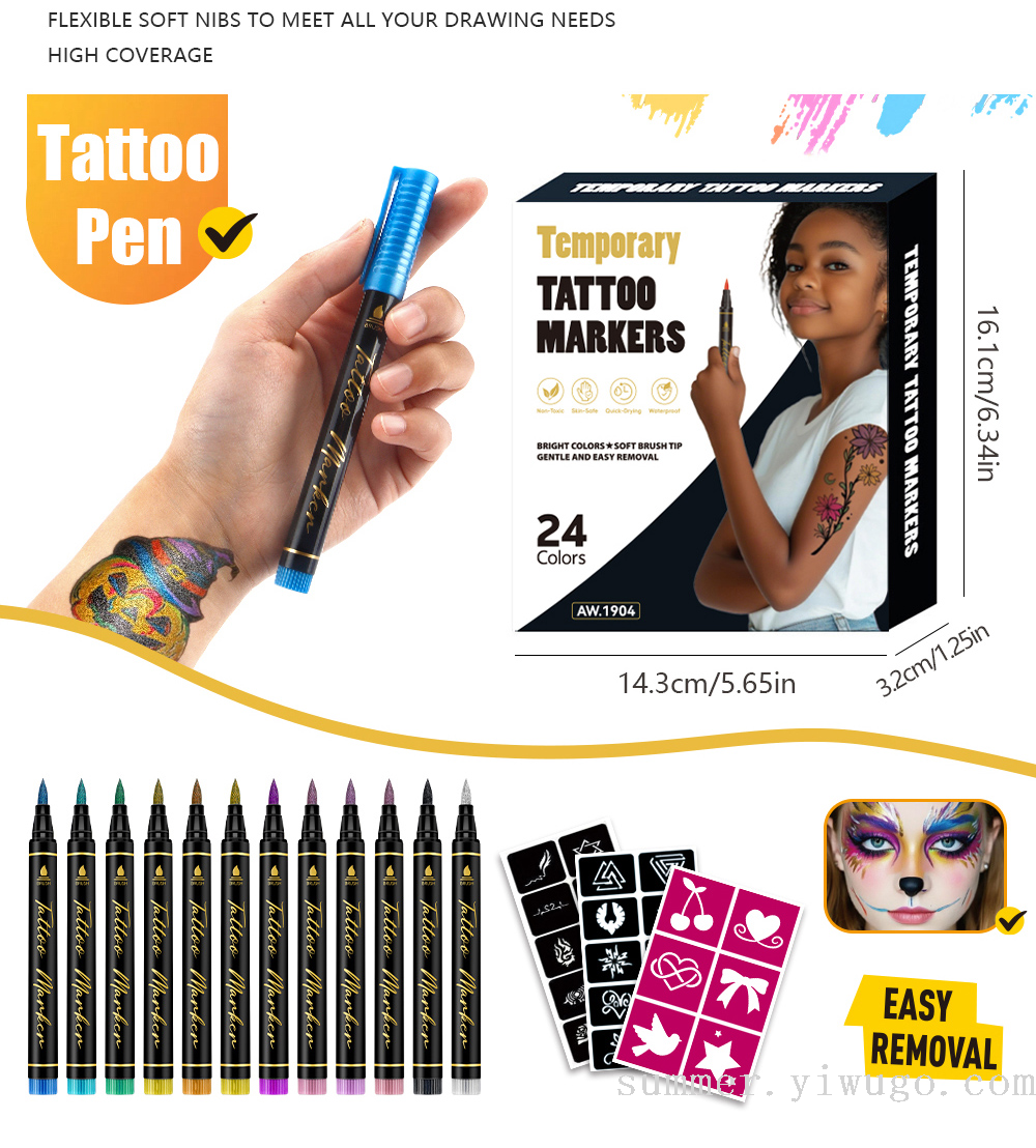 cross-border hot sale tattoo marker pen body fluoresent marker with accessories hollow stickers children's painting marker pen spot 中文版