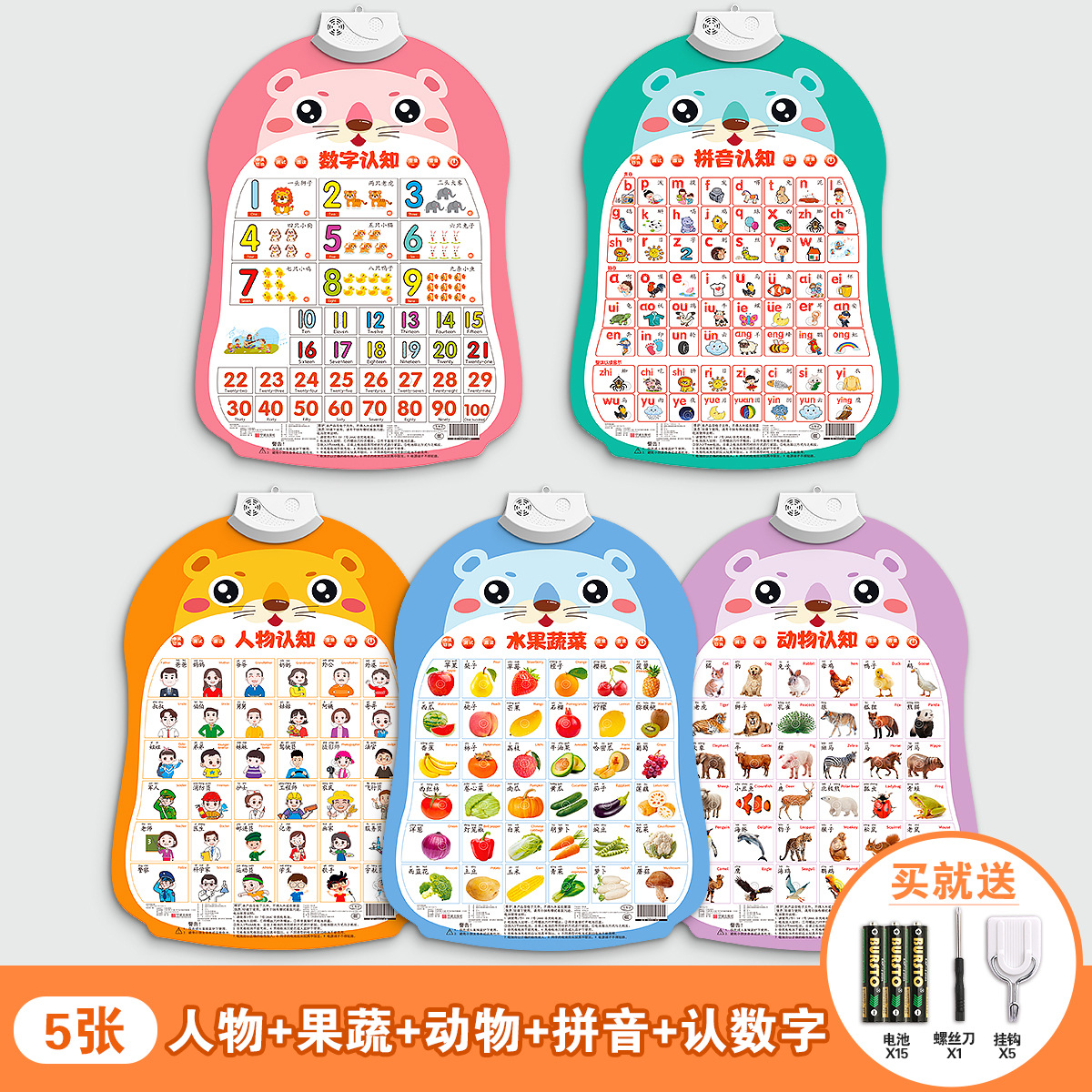 5 photos [characters + fruits and vegetables + animals + pinyin + recognition numbers]]