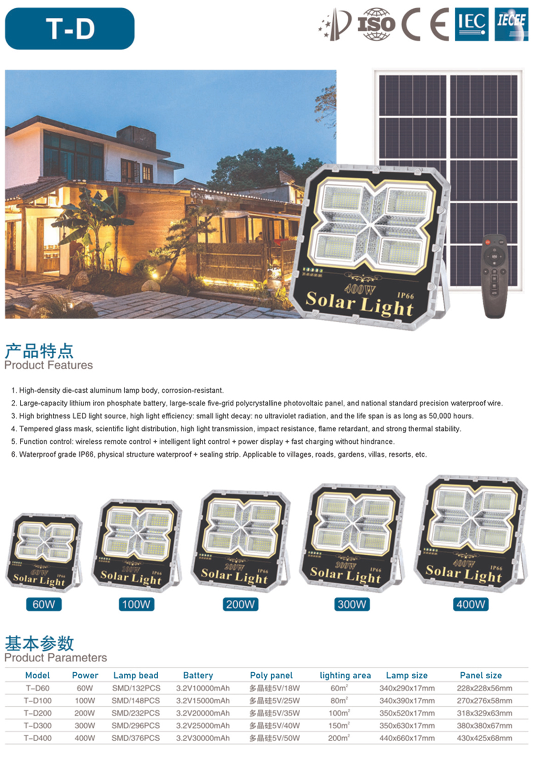| TD60 | Solar panel: Polysilicon (5V/18W) Power: 60W "LED: SMD2835 132PCS Waterproof rating: IP66 Battery: 3.2V/10000mAh Light body size: 228x56x228mm Lighting area: 60 Square meters Solar panel size: 340x290x17mm |