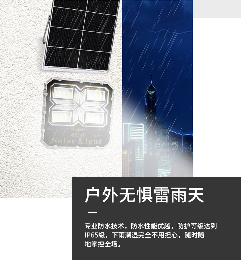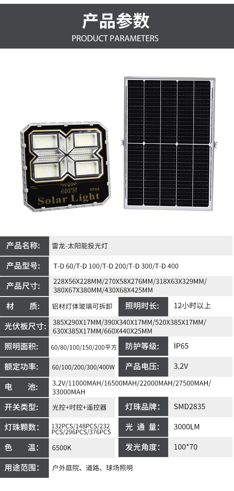 | TD400 | Solar panel: polysilicon (5V/50W) Power: 400W LED: SMD5730 376PCS Waterproof rating: IP66 Battery: 3.2V/30000mAh Lighting body size: 430x68x425mm Lighting area: 200 square Solar panel size: 440x660x25mm |