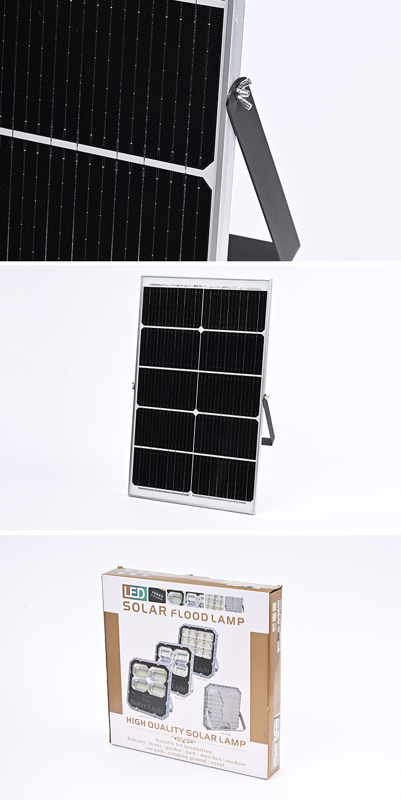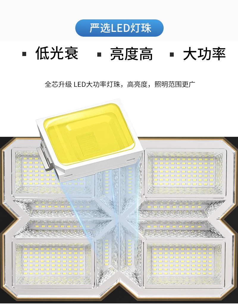 | TD 300 | Solar panel: Polysilicon (5V/40W) Power: 300W "LED: SMD5730 296 pieces Waterproof rating: IP66 Battery: 3.2V/25000mAh Light body size: 380x67x380mm Lighting area: 150 square meters Solar panel size: 350x630x17mm |