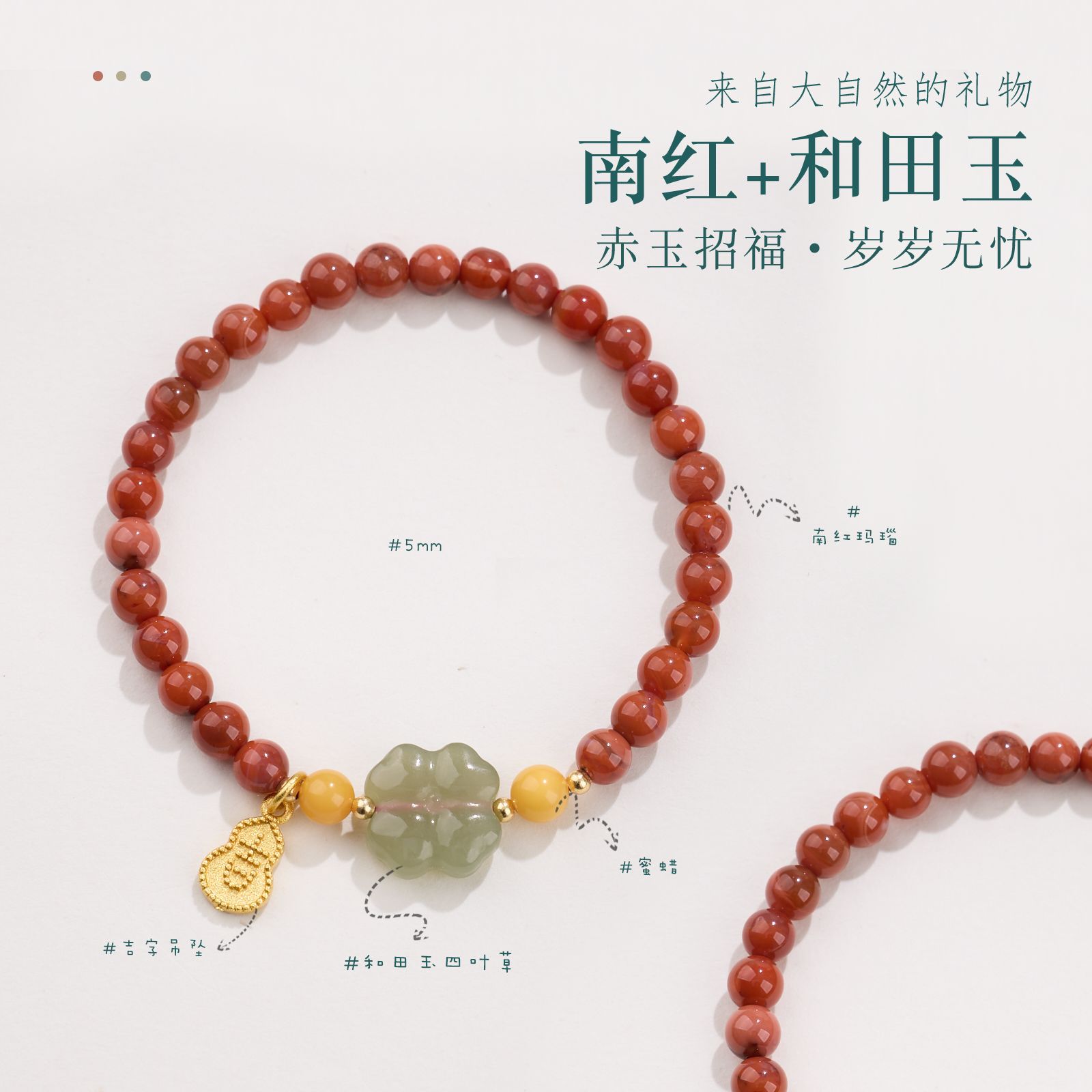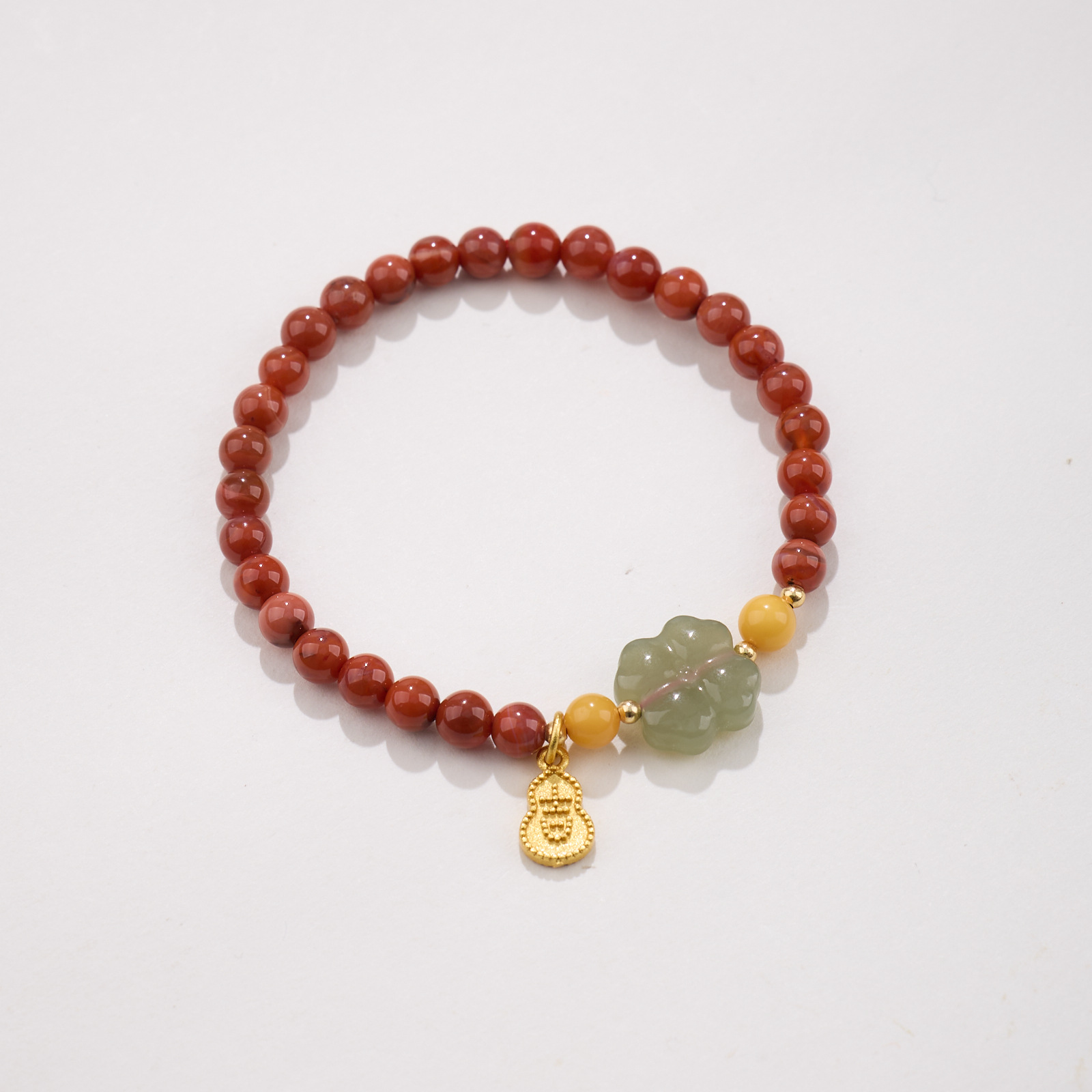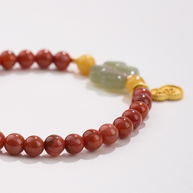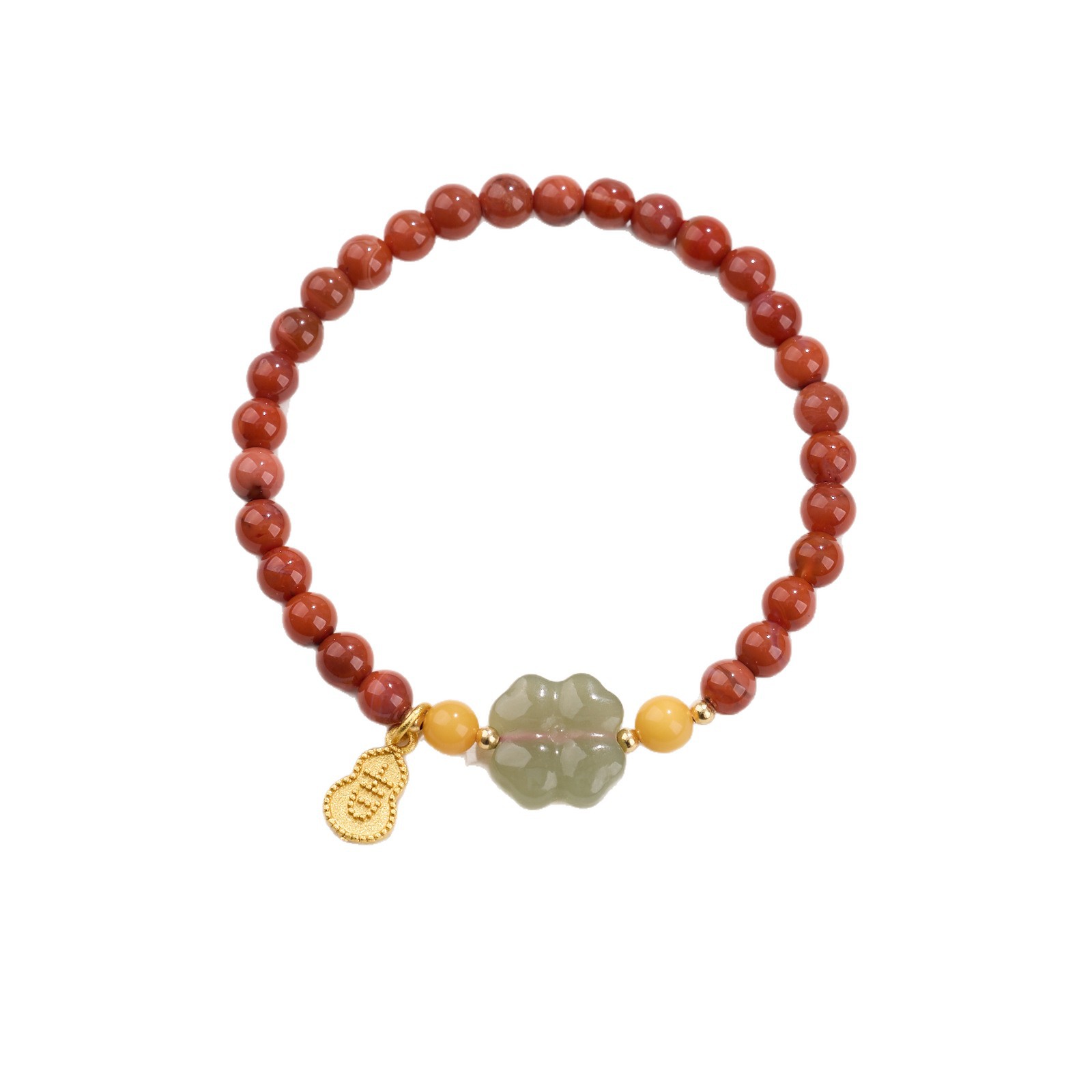 5MM South Red Agate, Amber, Four-Leaf Clover, Jadeite, and Gourd Bracelet with the Character '吉'