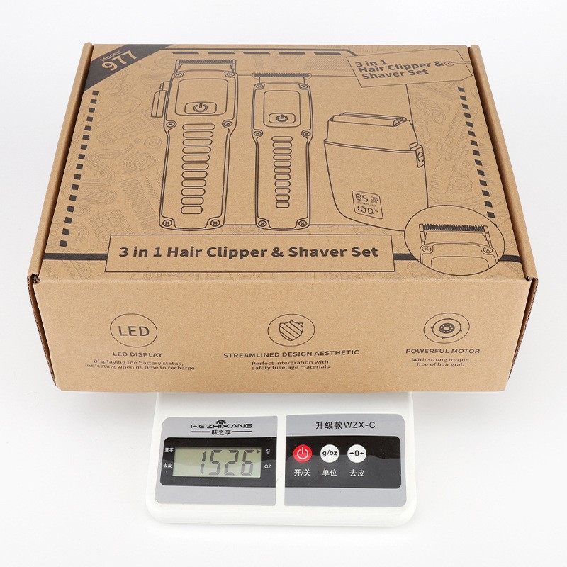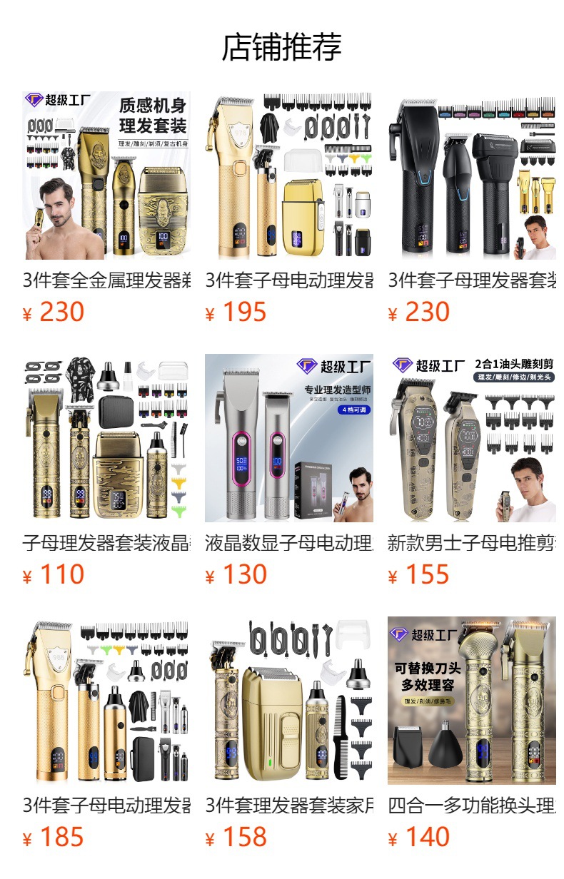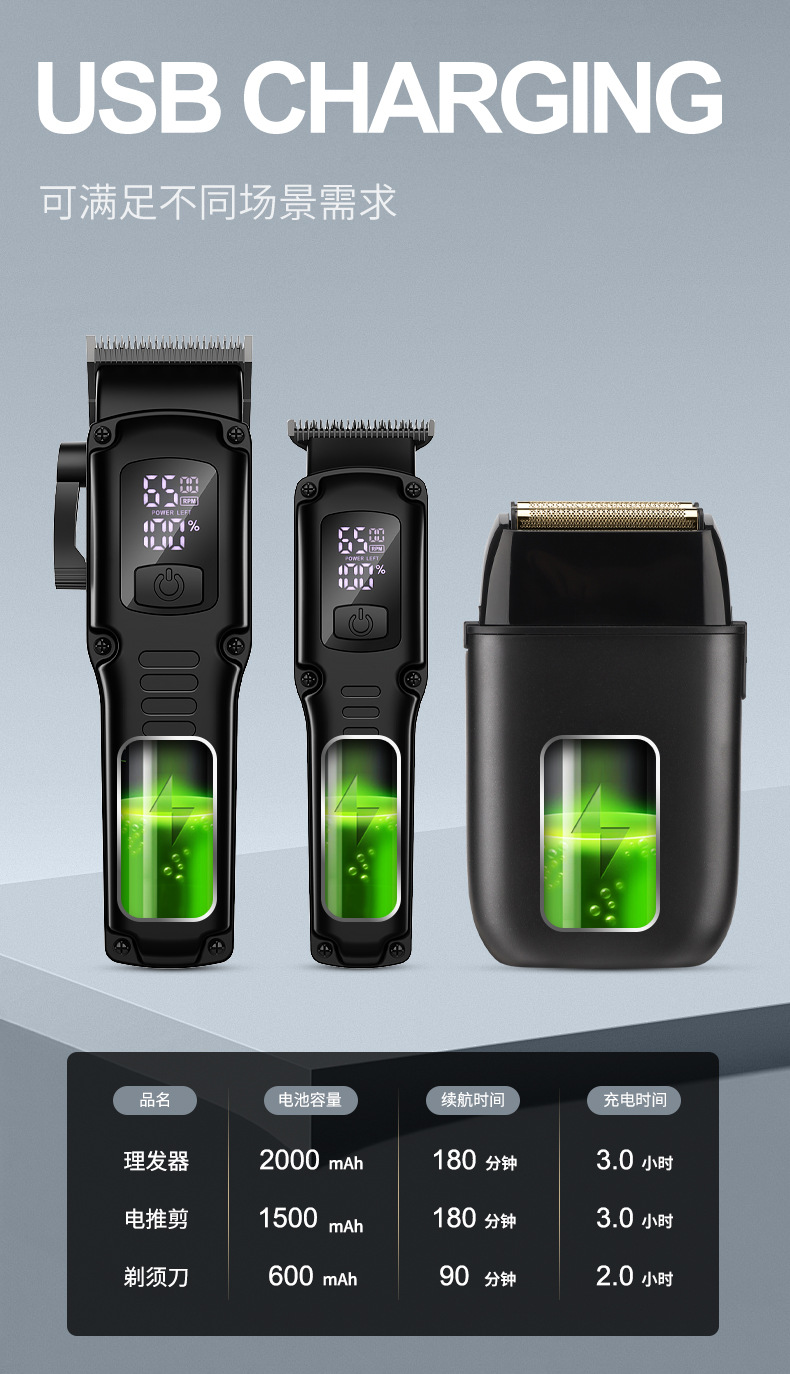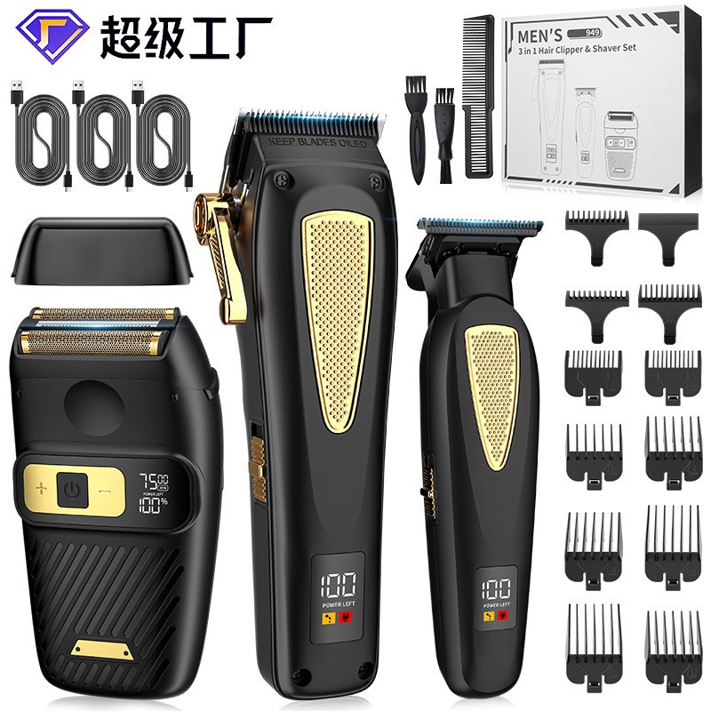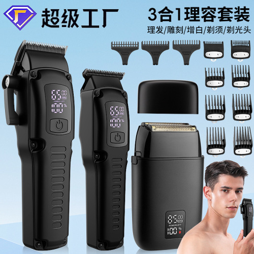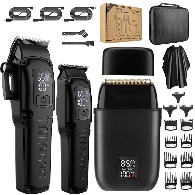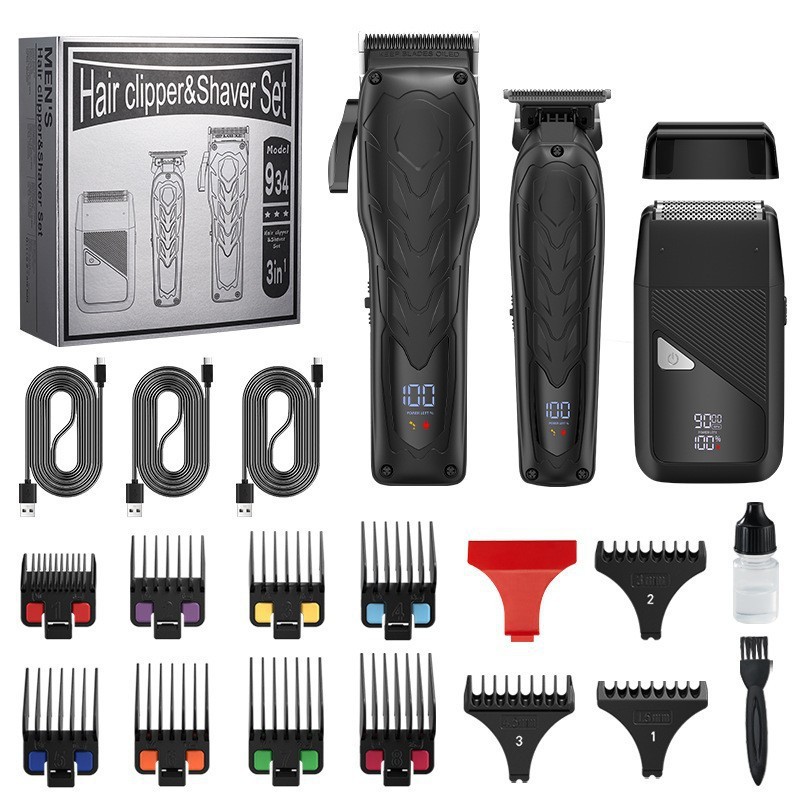 Product accessories: Professional hair clipper + carving hair clipper + rotary shaver + large limit comb * 8 + carving limit comb * 3 + charging cable * 3 + comb + cleaning brush + towel + EVA storage bag