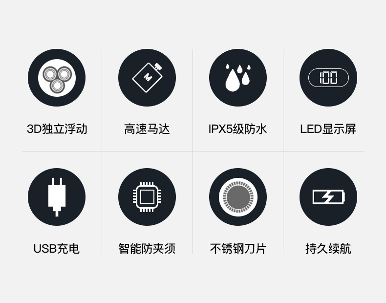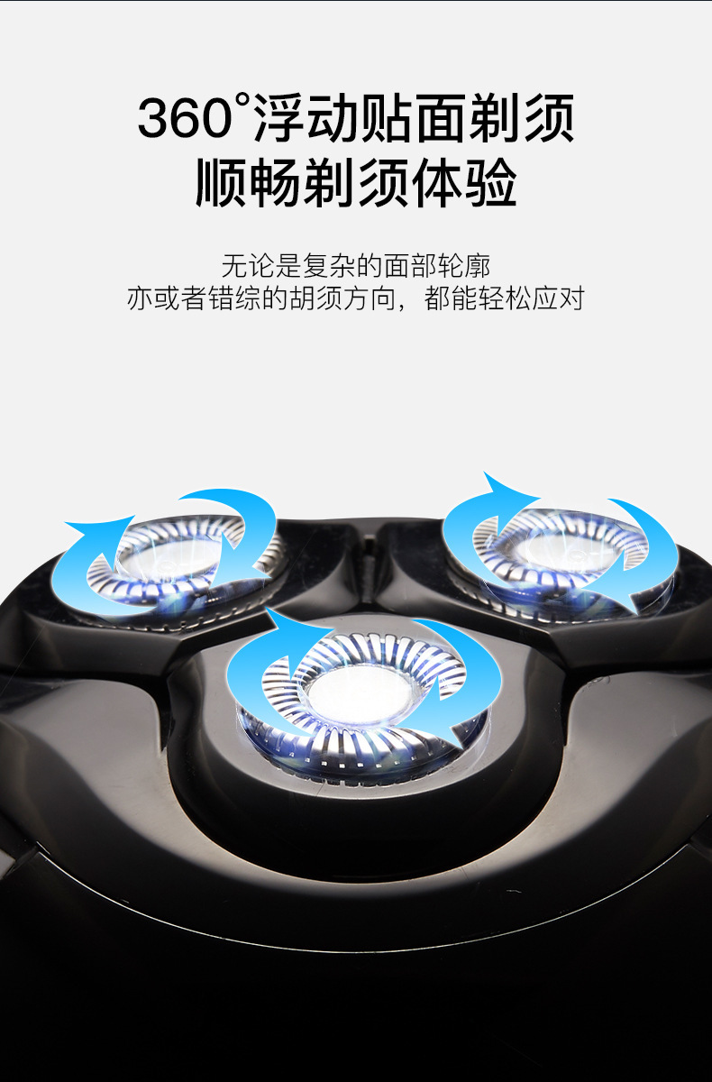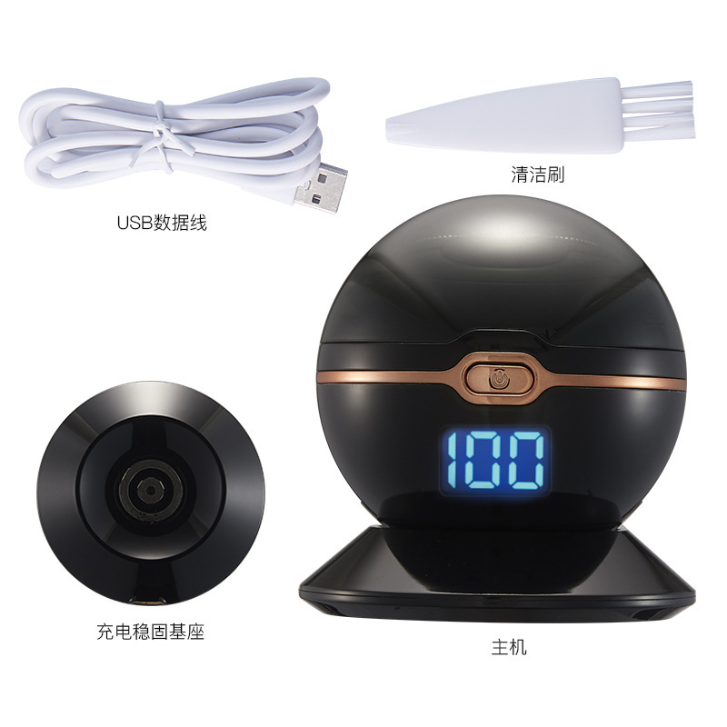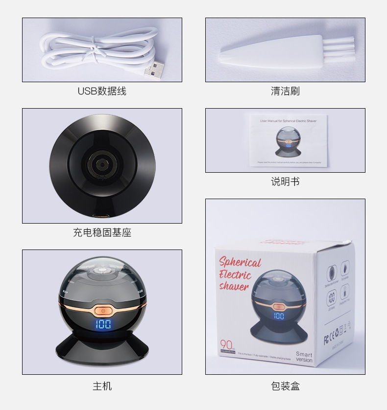 Product accessories: body, base, a USB charging cable, a cleaning brush, packaging box, instruction manual.