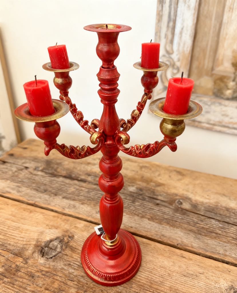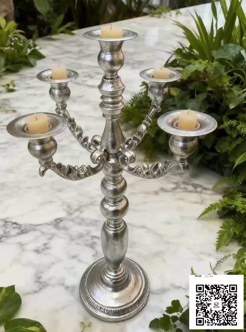 This five-headed iron art candle holder measures 51×17cm and is crafted with antique techniques, featuring gold foil, silver foil, and red gilded textures. Its five heads are designed to create a sense of retro ceremony, suitable for both European and American retro home decor. It can also be a mood-setter for festivals and parties. When lit with candles, the interweaving light and shadow add to the sense of sophistication.