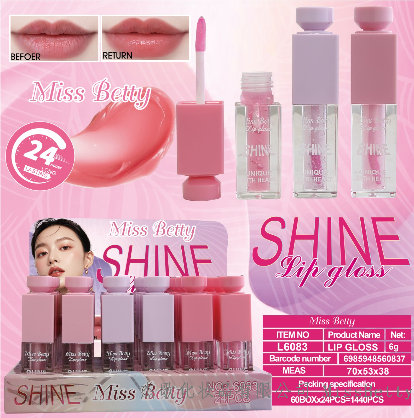 Our company specializes in cosmetics accessories, and our brand is MISS BETTY. Our main products include lipsticks, lip gloss, lip colors, mascaras, and eye liners. As a professional cosmetics manufacturing company, we have rich industry experience and extensive international cooperation, providing you with a variety of unique product choices. Our products are popular in many countries in the Middle East, South America, Europe, and the United States. Please contact us at 18757673800!