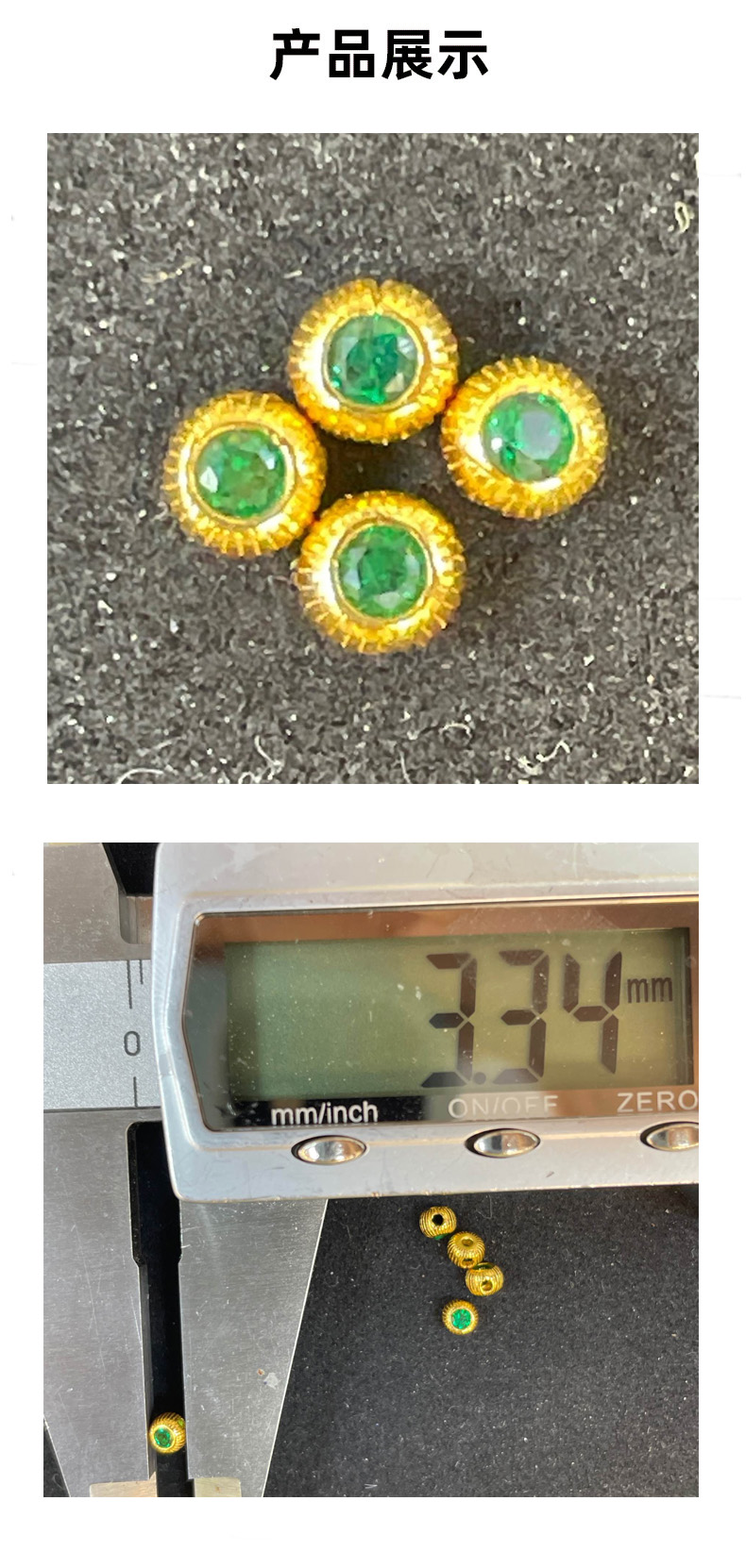 Circular main body + Emerald setting + Textured border + Through-hole structure
