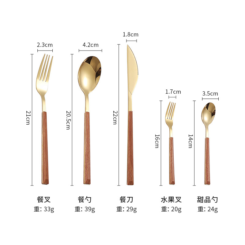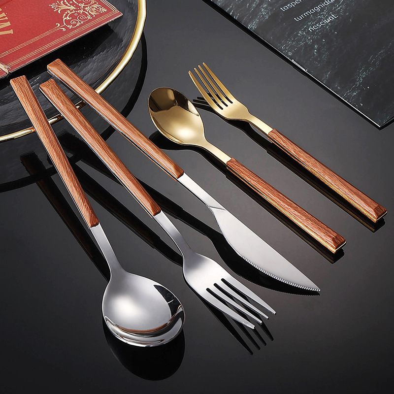 cross-border 430 stainless steel tableware clip handle imitation wood grain knife, fork and spoon five-piece set household korean steak knife and fork set 中文版