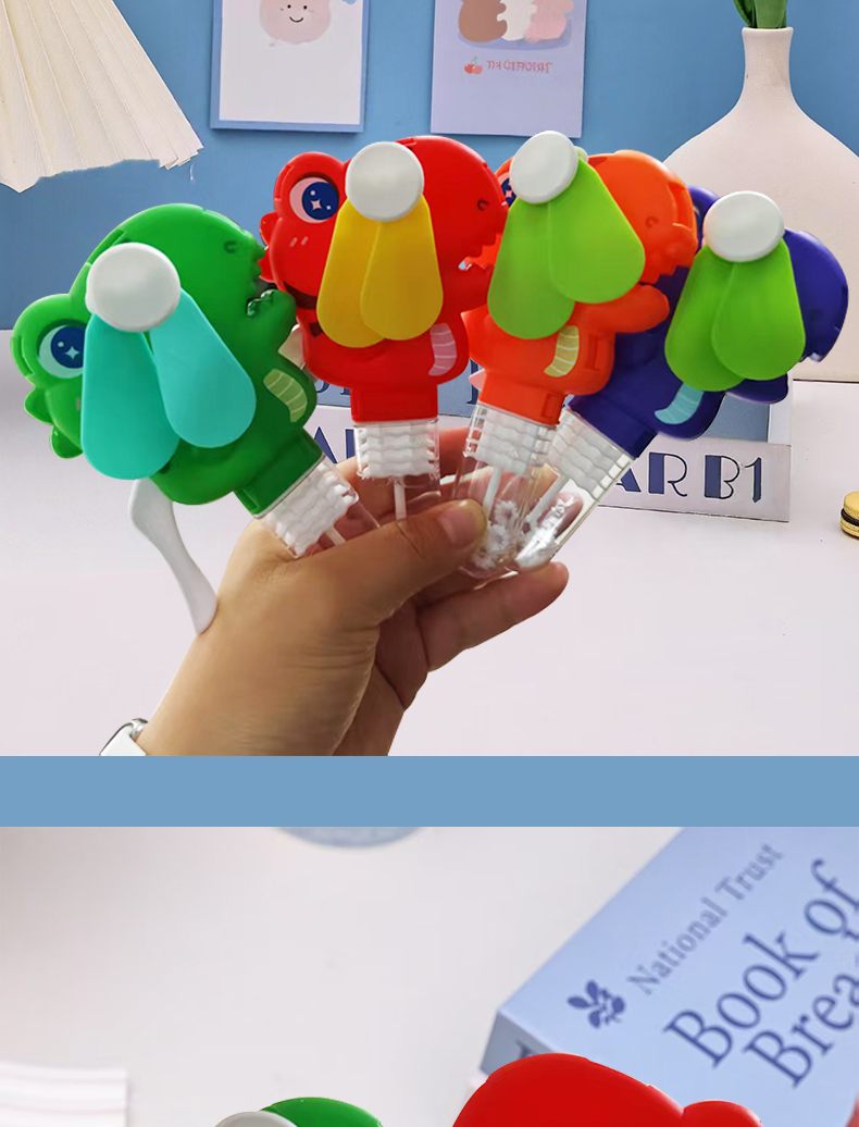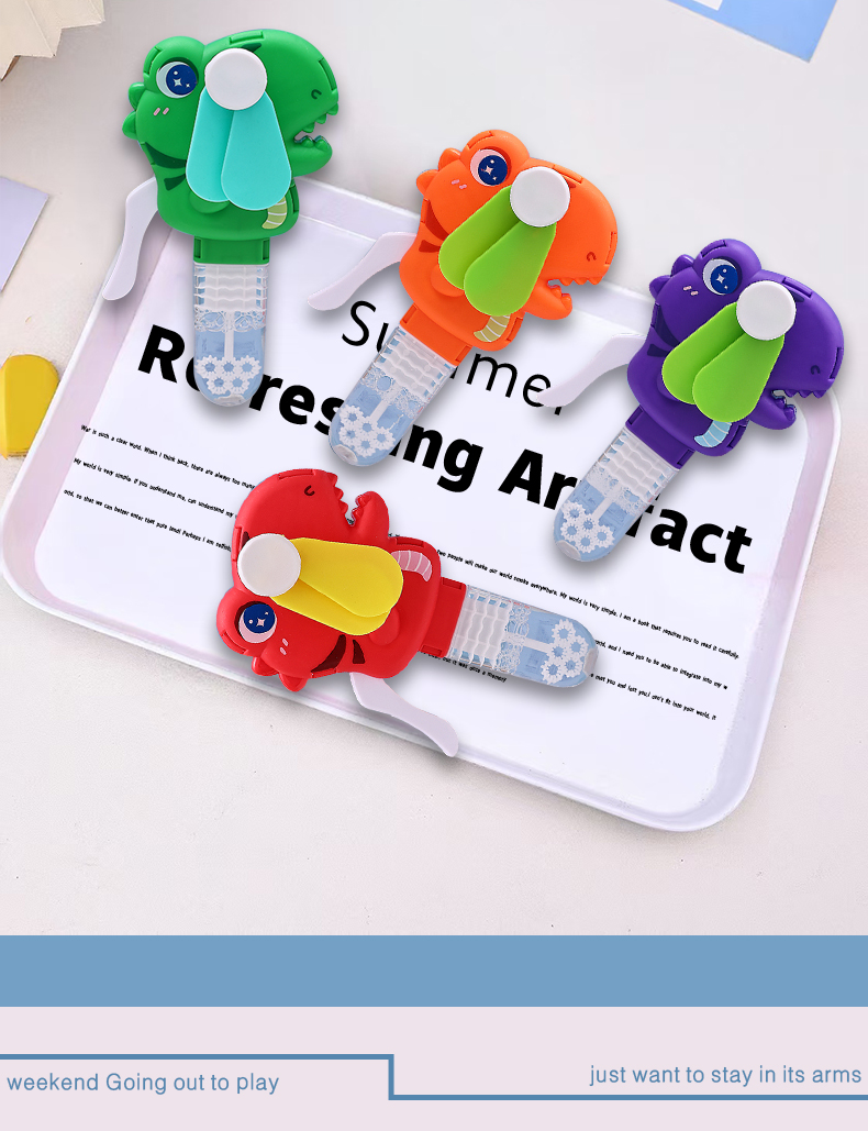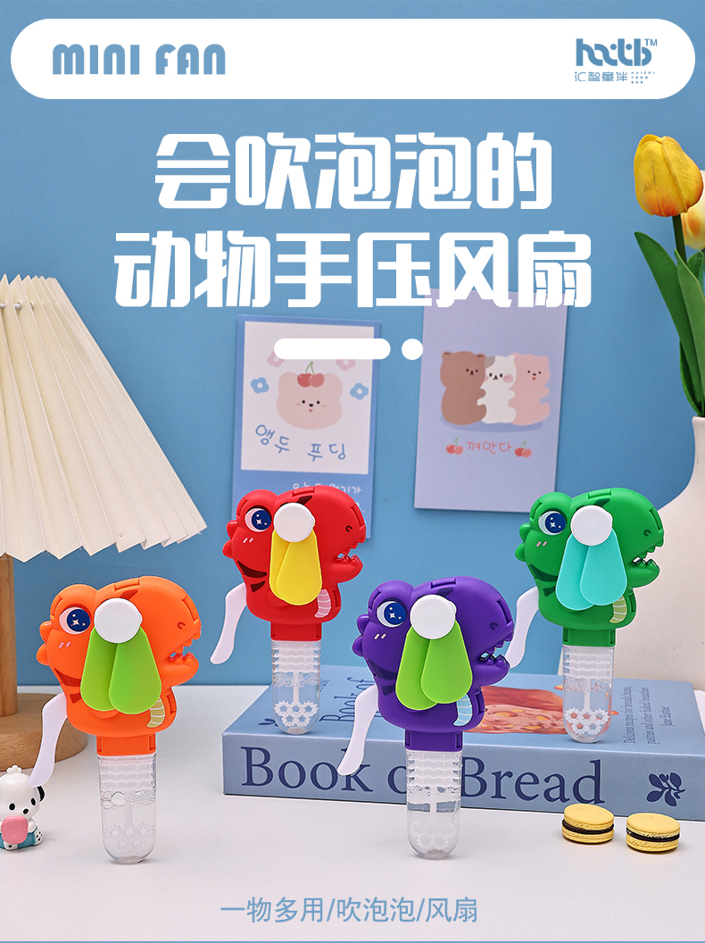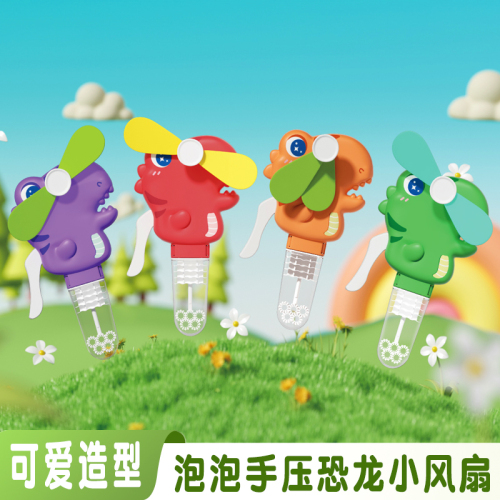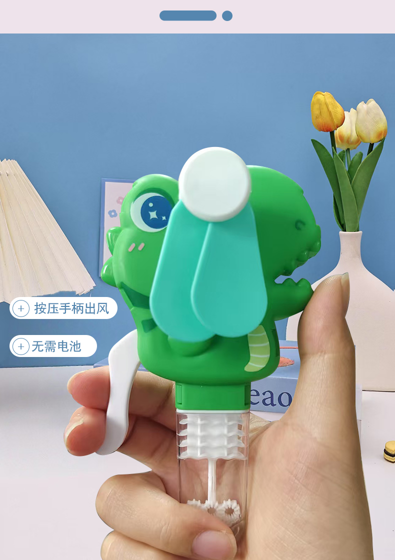 手压款动物小风扇,无需电池,环保节能,便携设计,适合户外活动。解决用户炎热痛点,提供清凉体验。通过CE,EN71,3C,认证,品质可靠。可爱恐龙造型,可吹泡泡,激发童年回忆,是外贸赠品和国内玩具,提升生活乐趣。