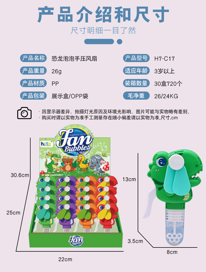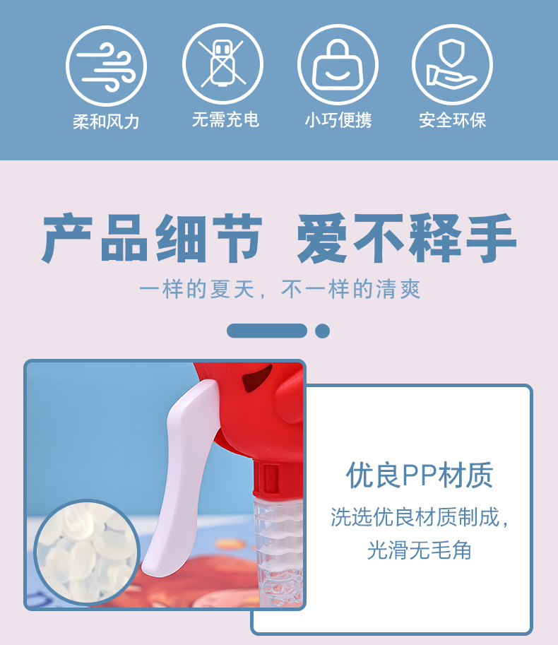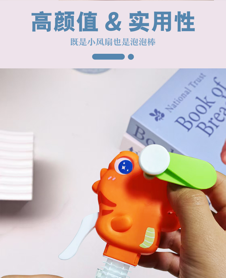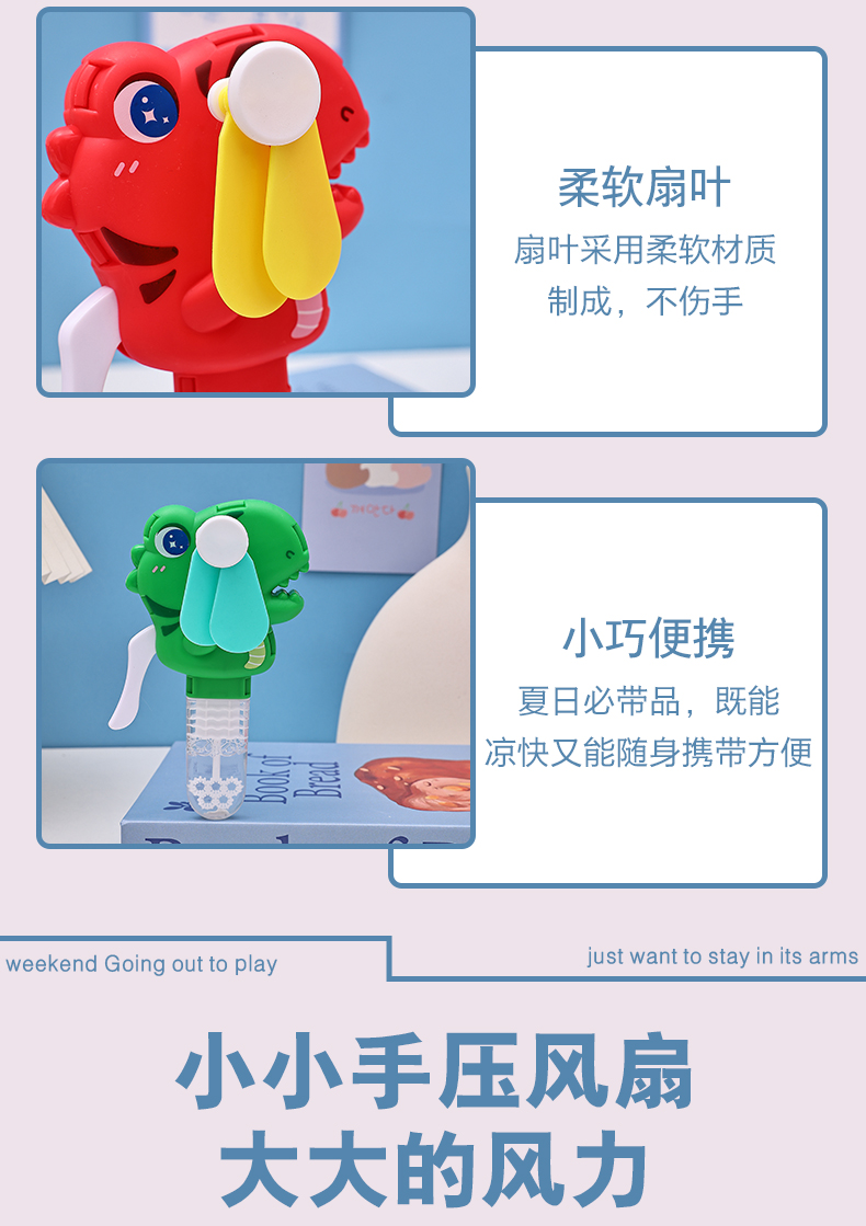 手压款动物小风扇,无需电池,环保节能,便携设计,适合户外活动。解决用户炎热痛点,提供清凉体验。通过CE,EN71,3C,认证,品质可靠。可爱恐龙造型,可吹泡泡,激发童年回忆,是外贸赠品和国内玩具,提升生活乐趣。