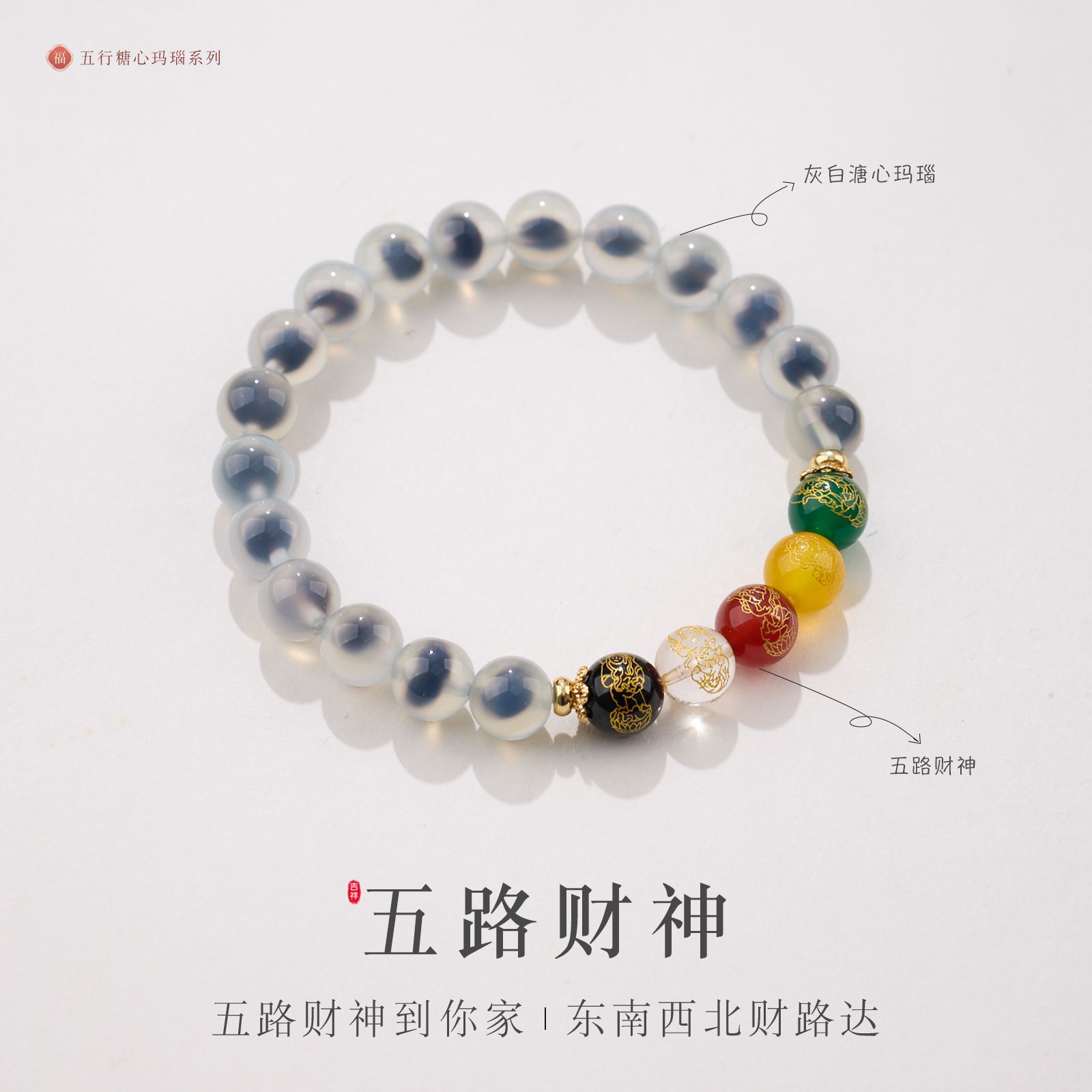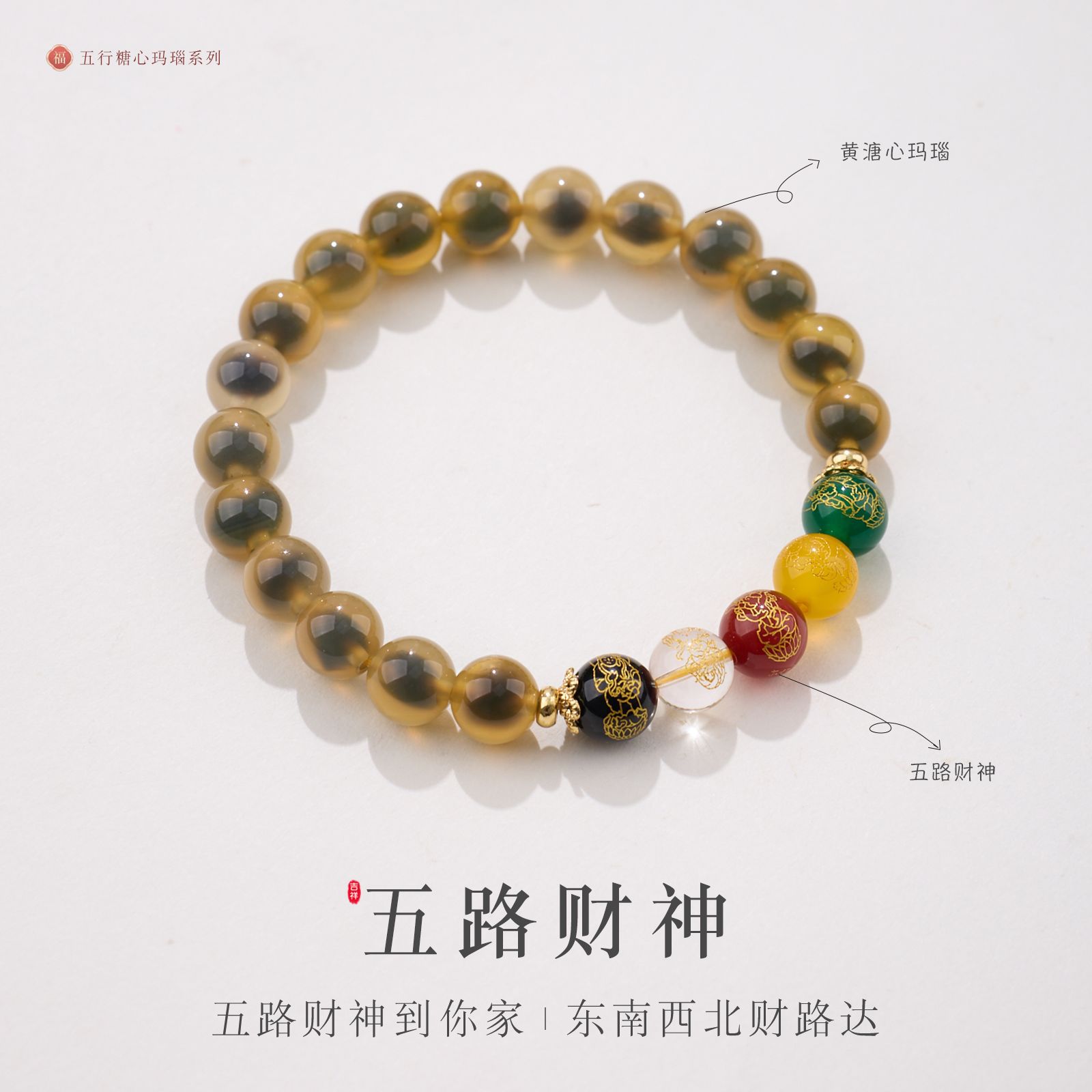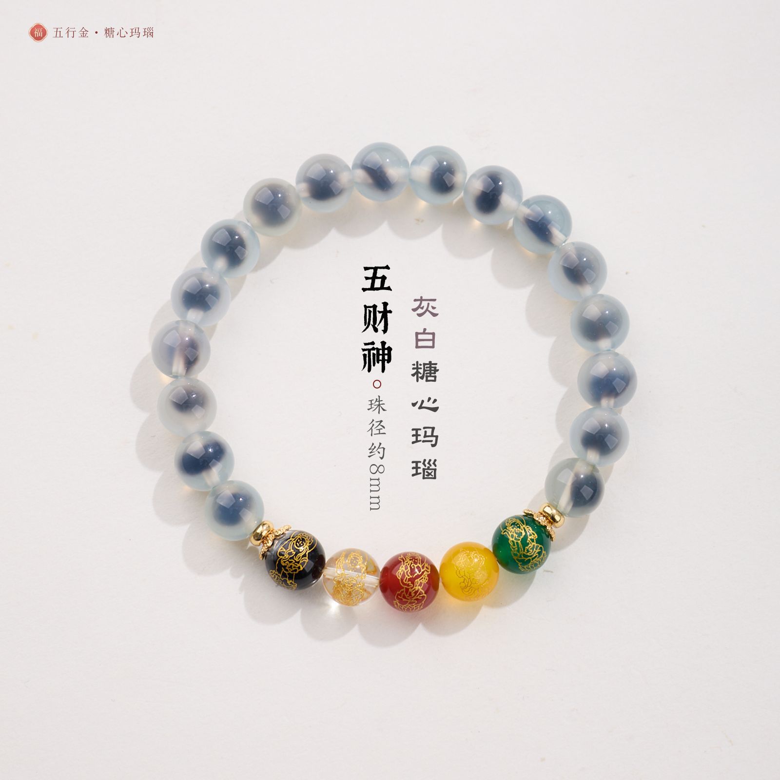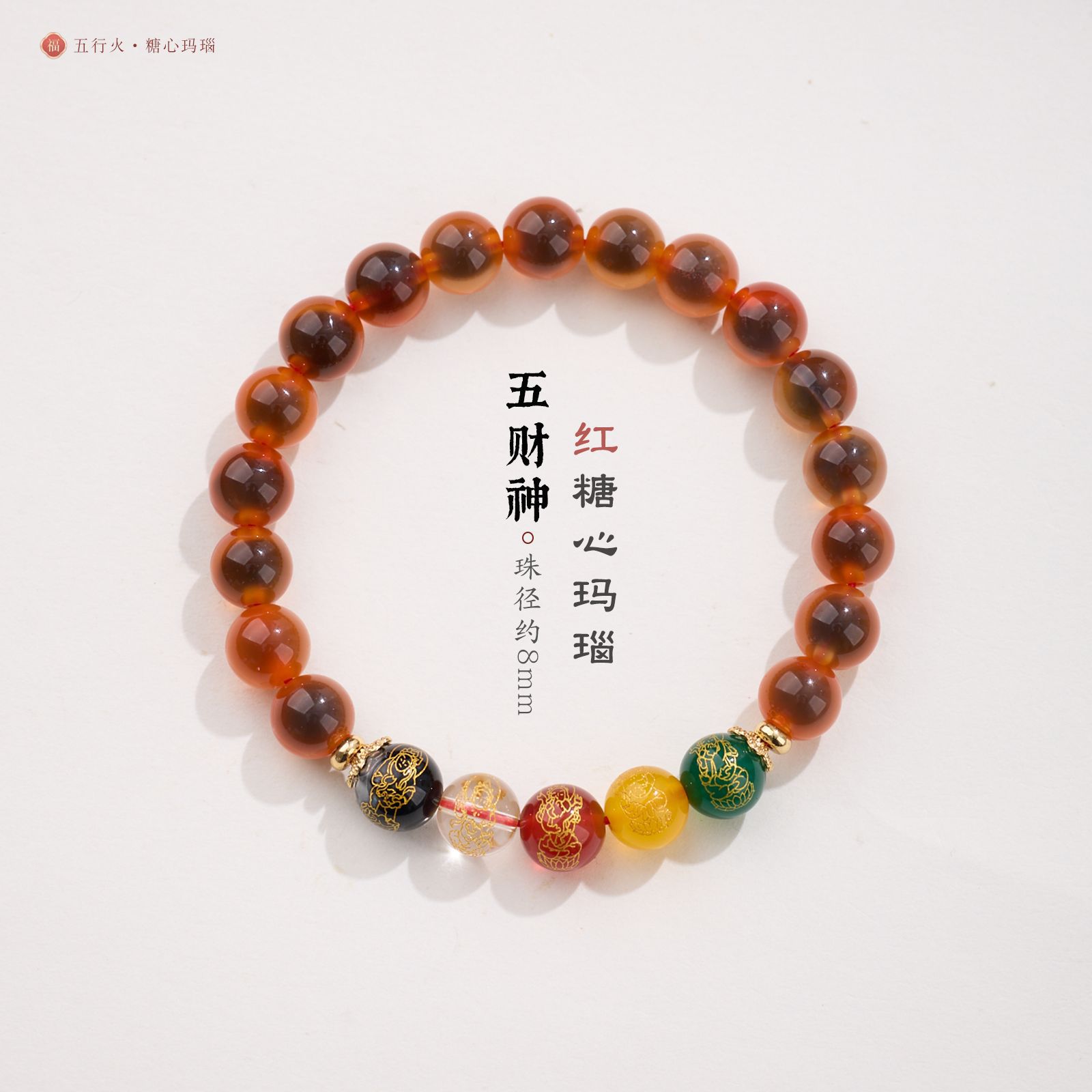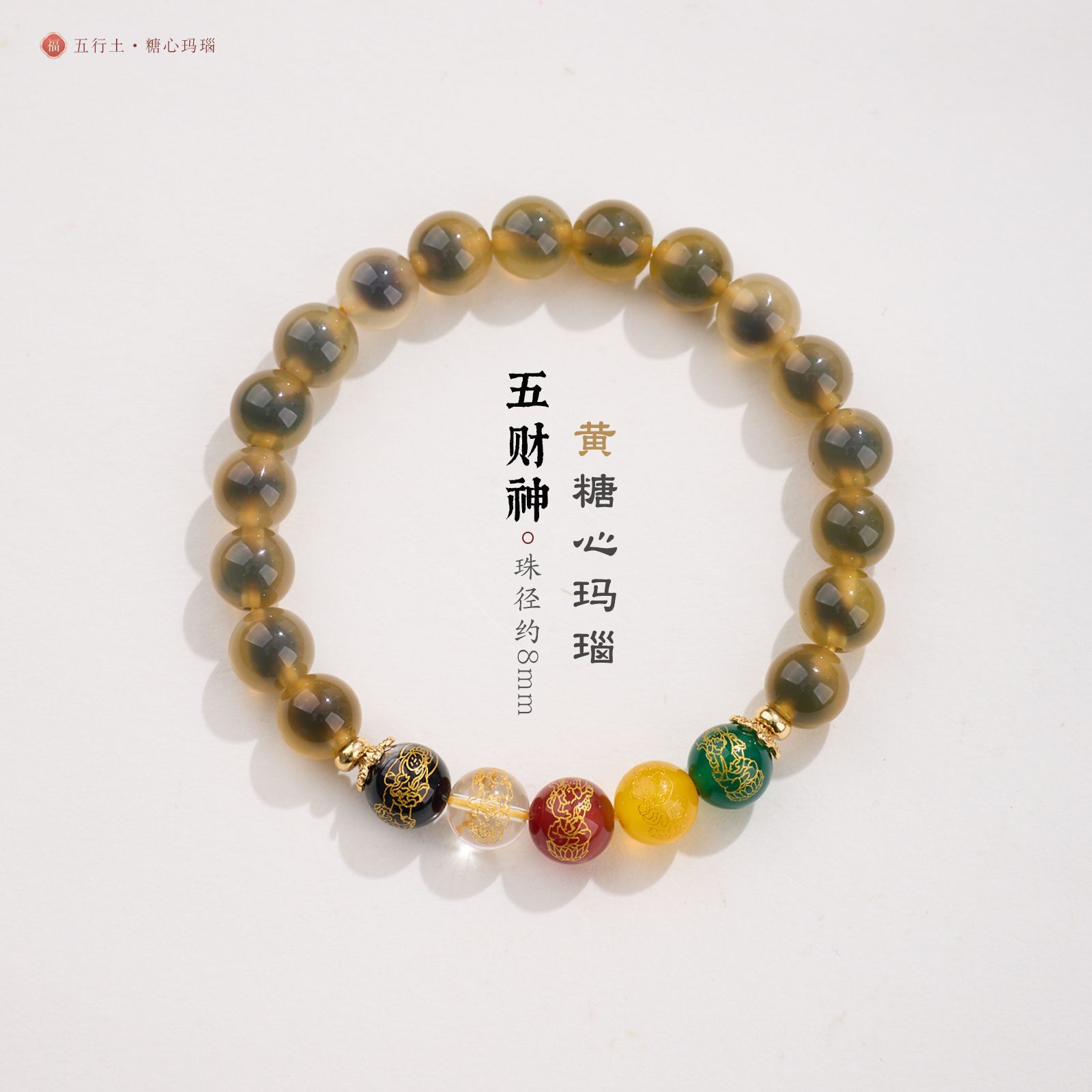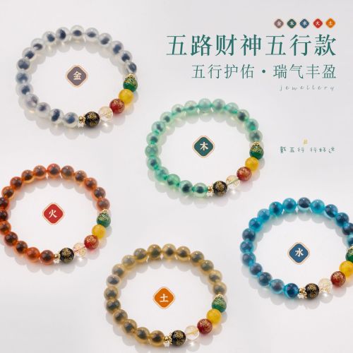 8MM Sugar Heart Agate Five Fortune Gods Five Elements Bracelet