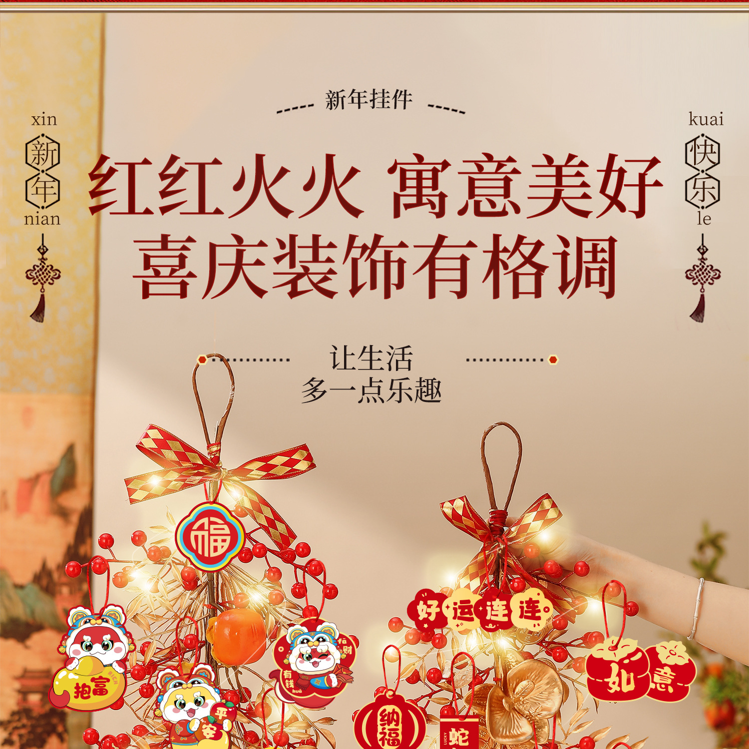 red fortune fruit strings + ping an joy pendant + led lighting chain