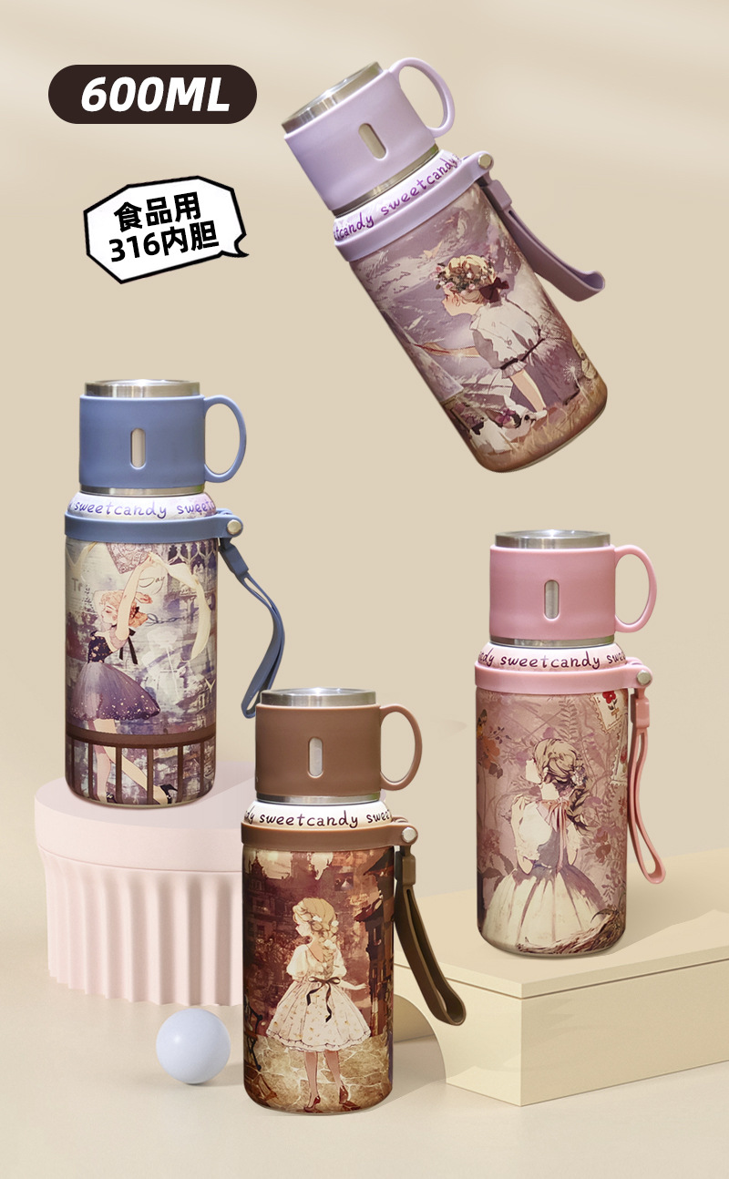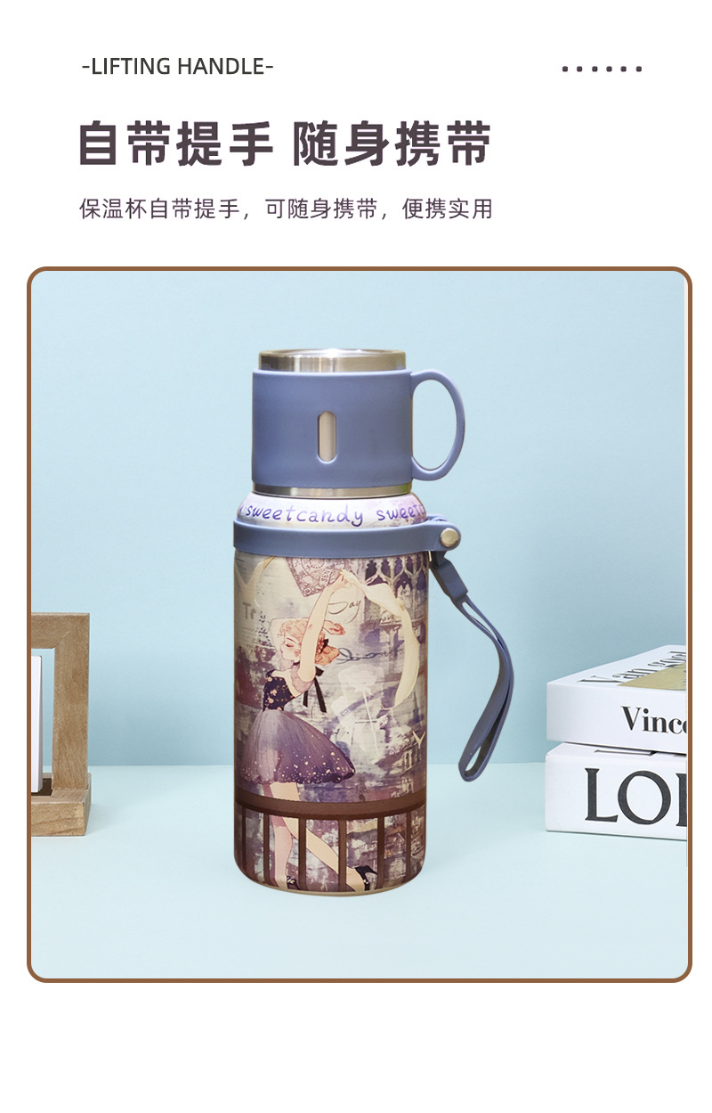oil painting girl bowl cup with cover vacuum cup with lid portable rope holding vacuum cup tea water separation can be tea brewing water cup 中文版