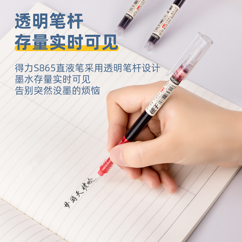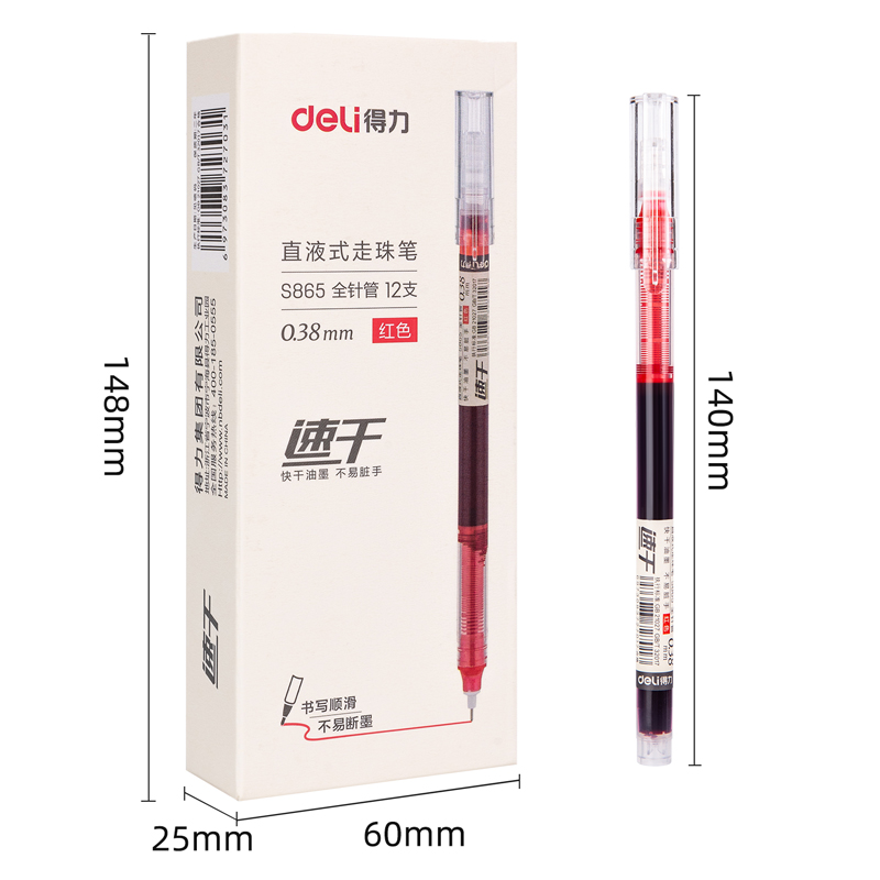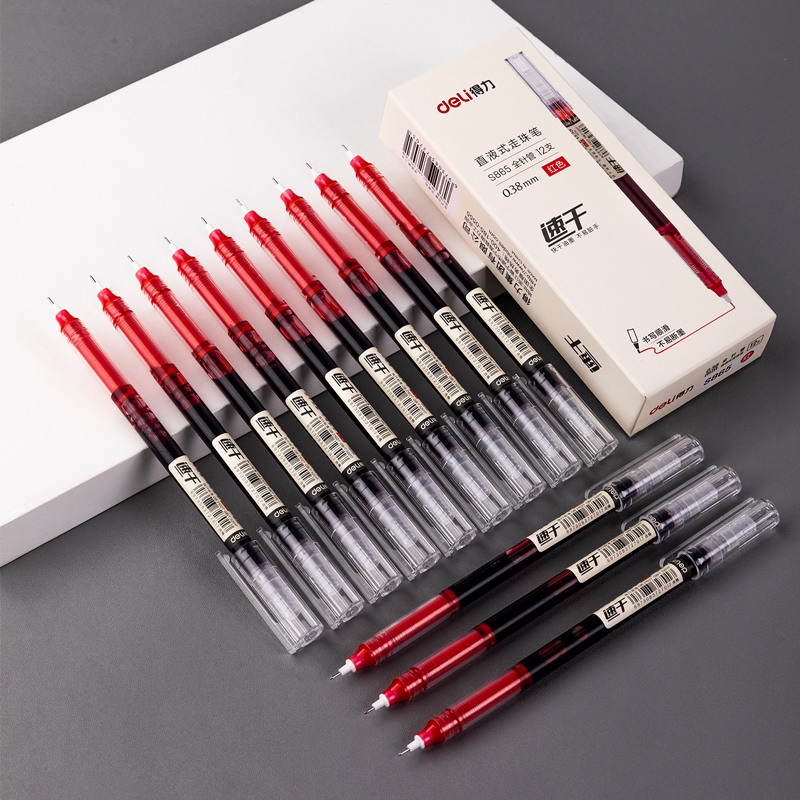 deli 0.38mm full needle tube head red ink straight-liquid quick-drying pull cap ballpoint pen 中文版