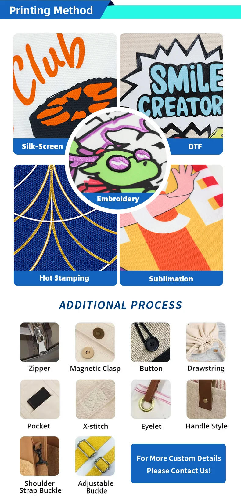Silkscreen printing,embroidery,heat-transfer,sublimation,digital printing etc.