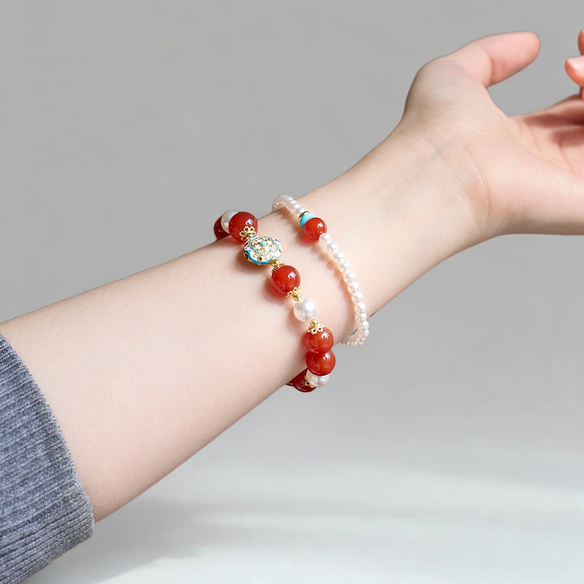 [red crisp] 10mm red agate shijia pearl retro enamel turquoise bracelet