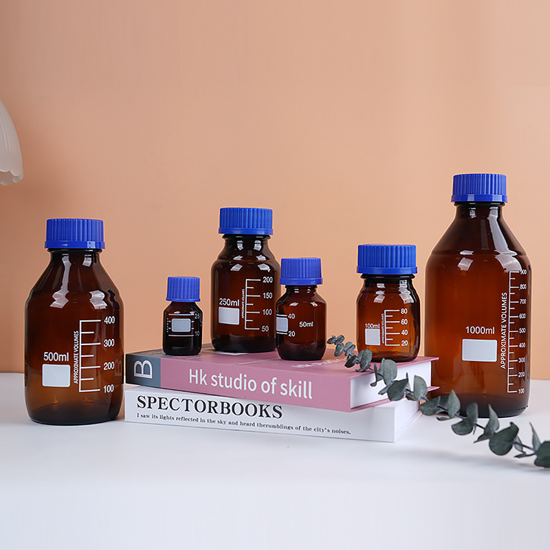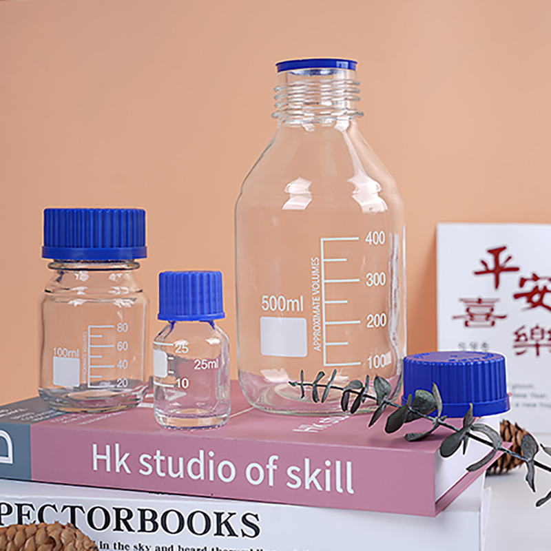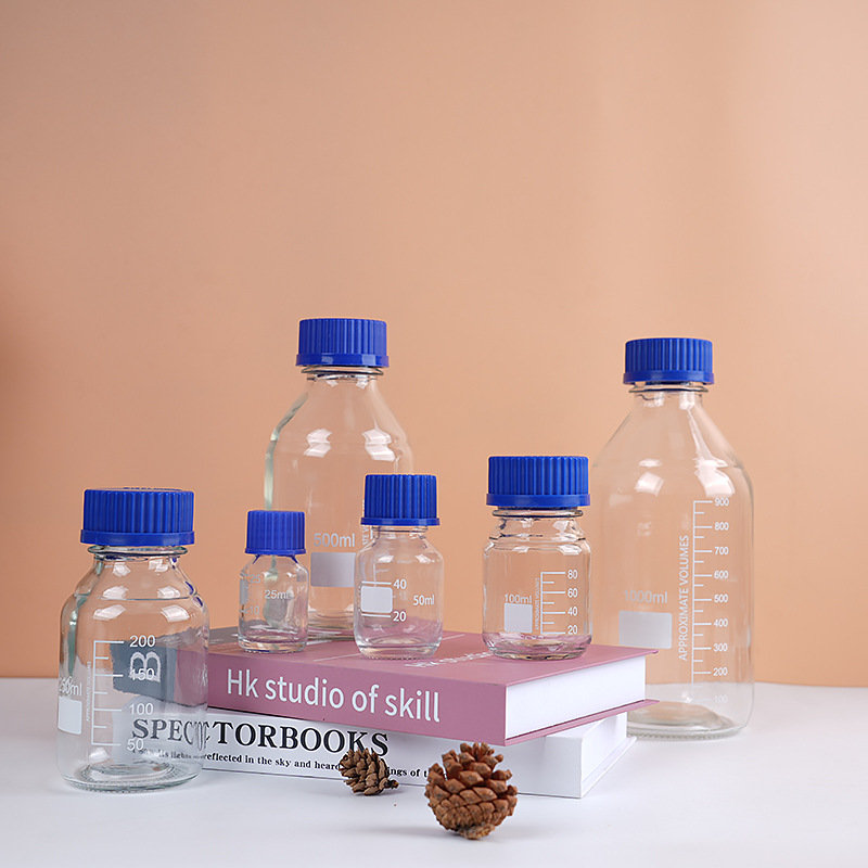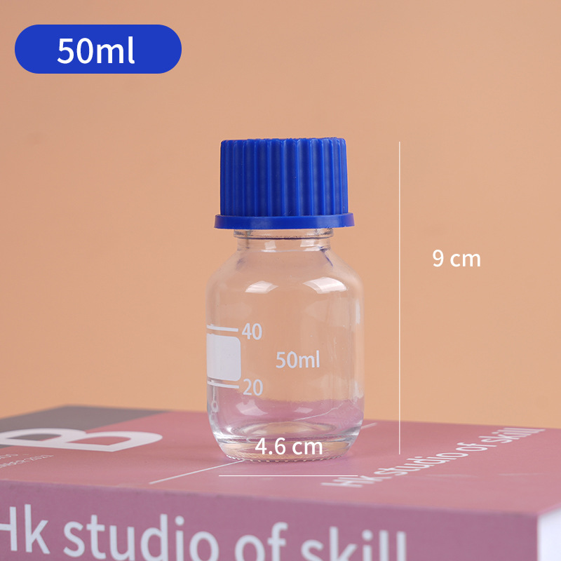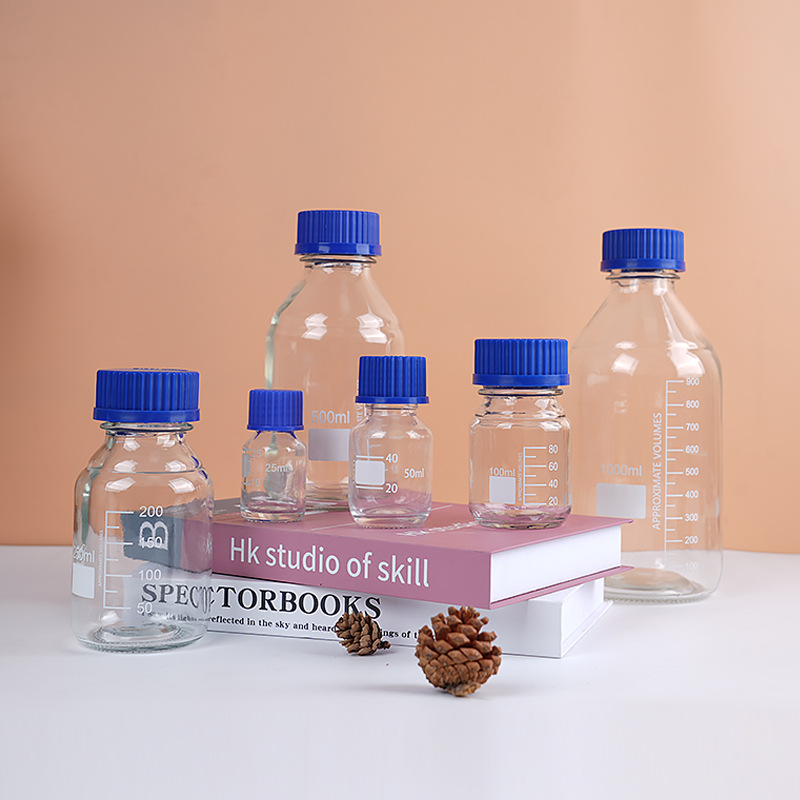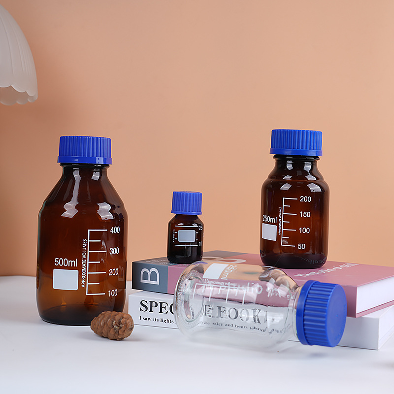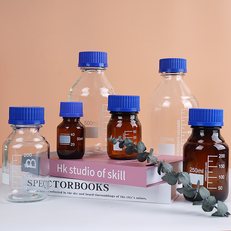 wholesale wide mouth blue cover reagent bottle screw mouth experiment bottle transparent brown with scale capacity remark glass bottle