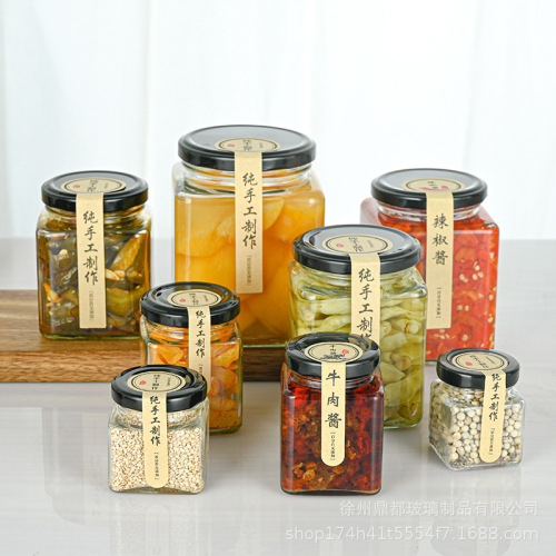 factory wholesale cans square a bottle of honey 380ml glass sealed chili sauce bottle jam jar pickles bottles