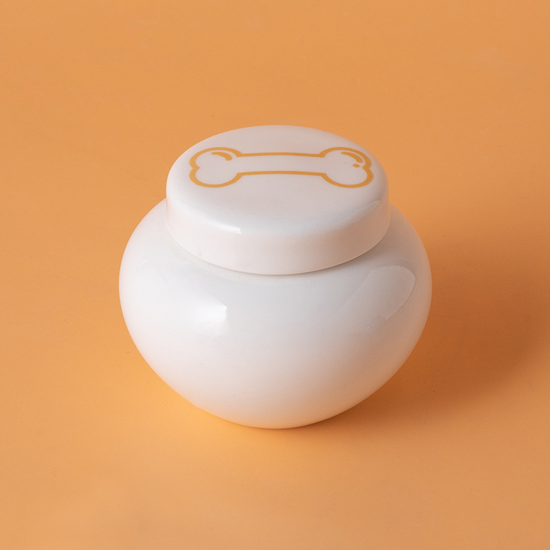 round funeral urn (white) (golden dog biting head)