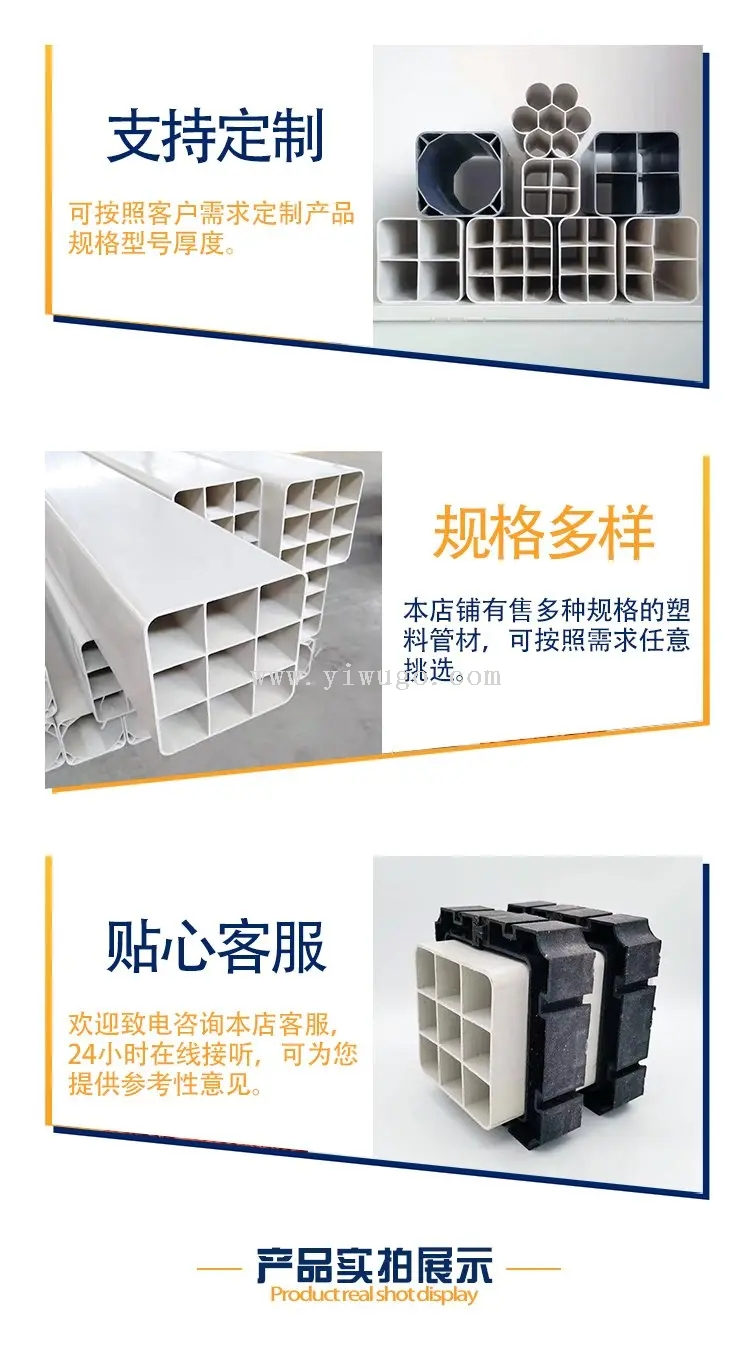 通信管PVC九孔格栅管与四孔单孔格栅管,专为埋地敷设电缆光缆设计。核心卖点:高强度PVC材质,耐腐蚀、抗压,确保长期稳定使用。产品优势:安装简便,节省成本,提升布线效率。解决用户痛点:避免电缆混乱,增强安全防护。品牌通过ISO认证,品质可靠。选择我们,为您的通信工程保驾护航,安心无忧。