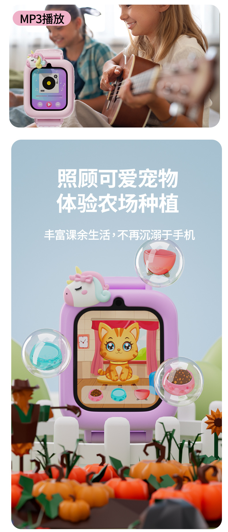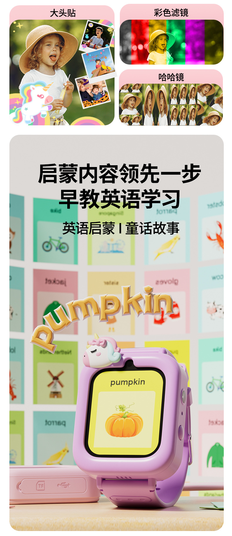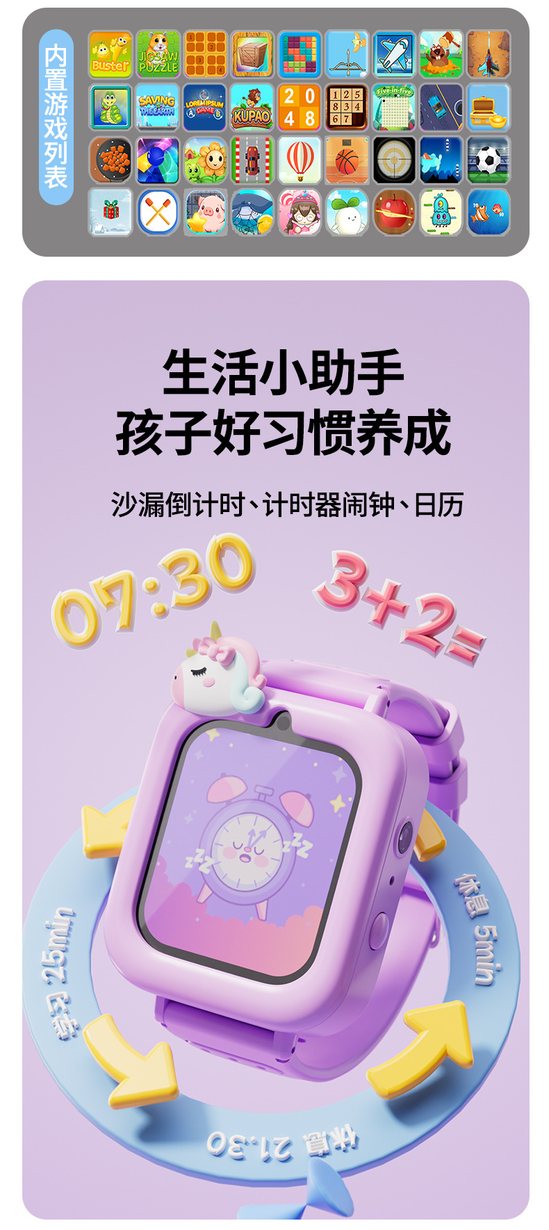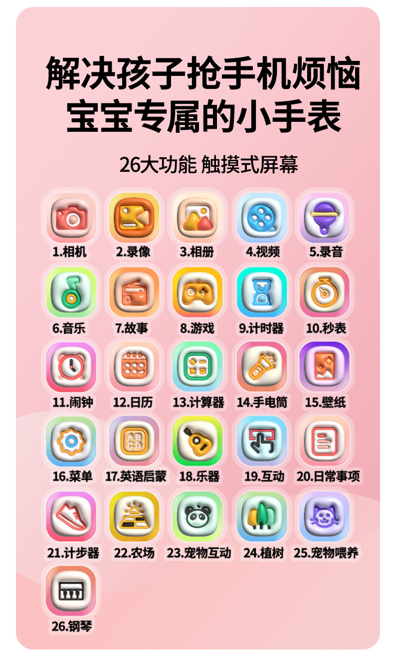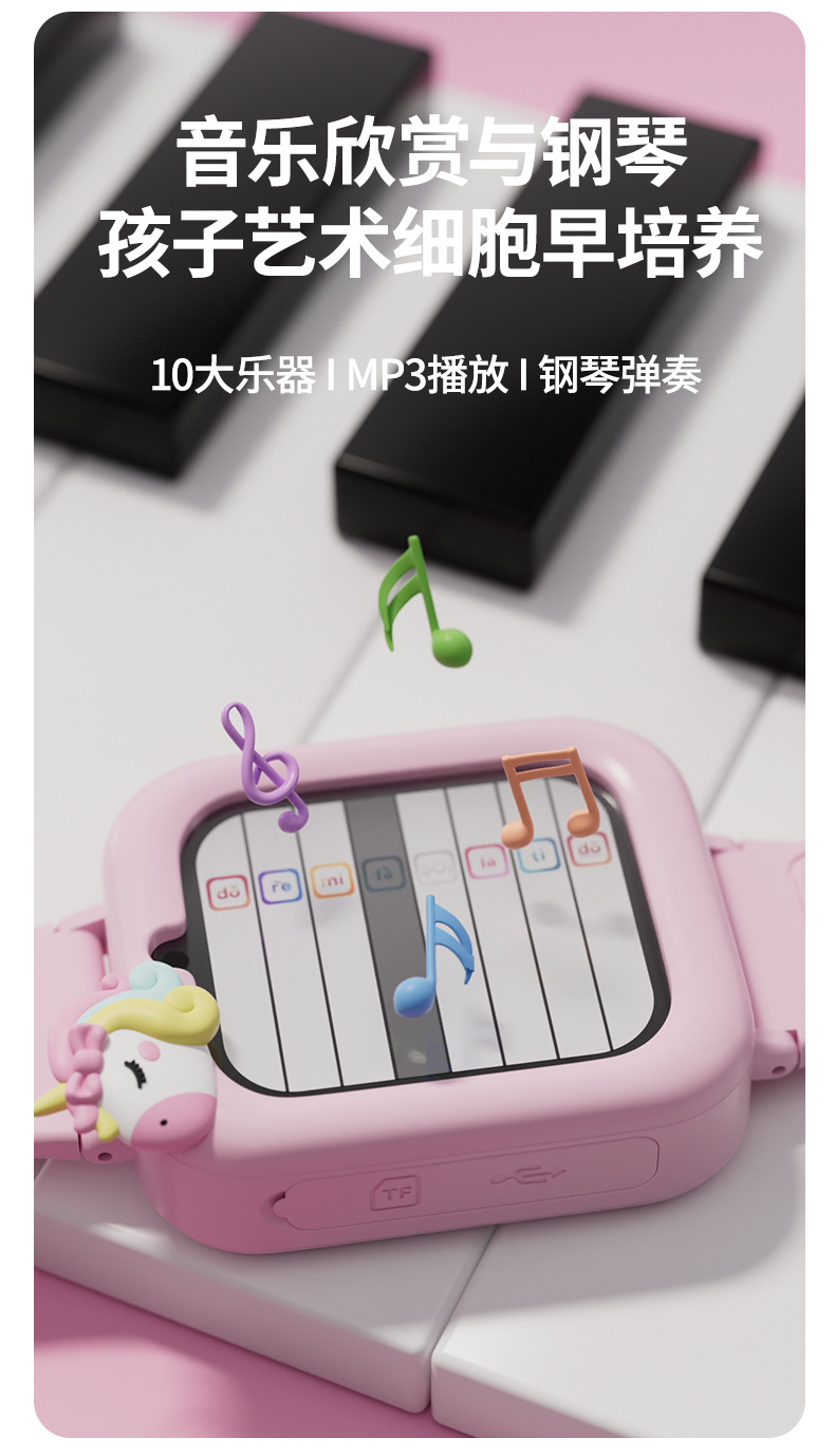 21 applications: Recording, Music, Stories, Games (36), Timer, Stopwatch, Alarm, Calendar, Calculator, Torch, Wallpaper, Step Counter, ABC, Musical Instruments, Interaction, Daily Matters, Little Treasure, Growth Tree Farm, Little Pudding, Piano