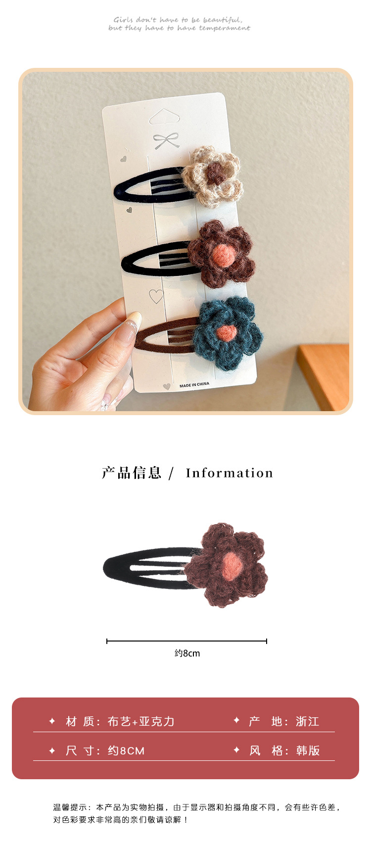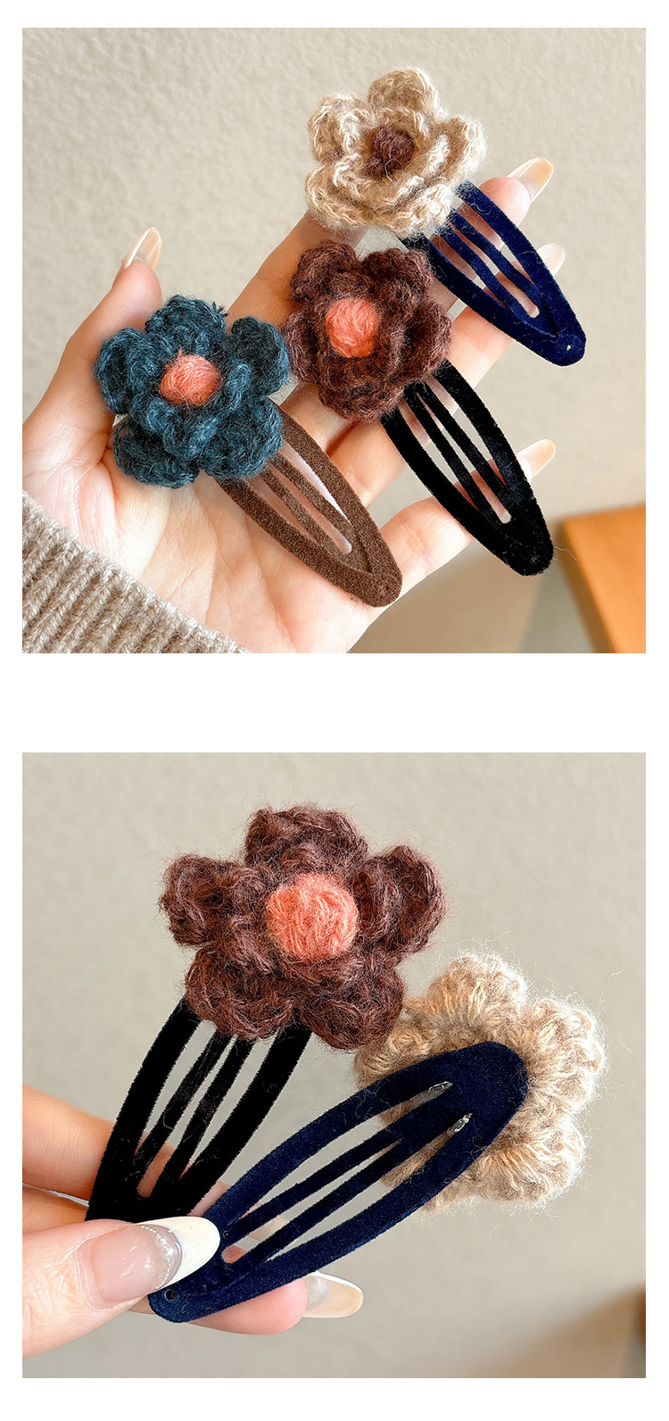 coffee color wool flower barrettes 1