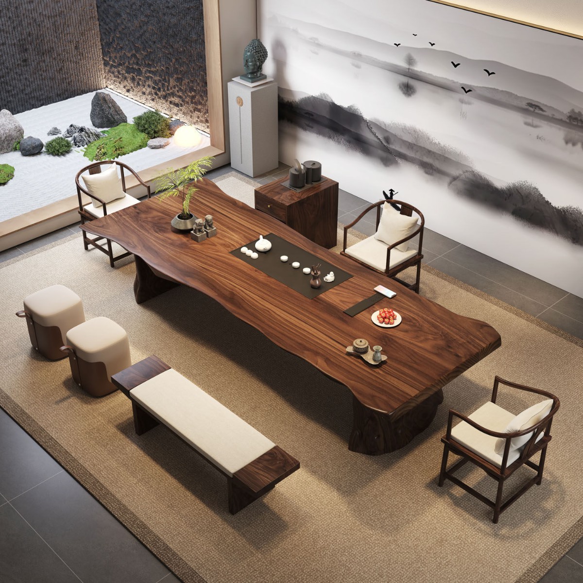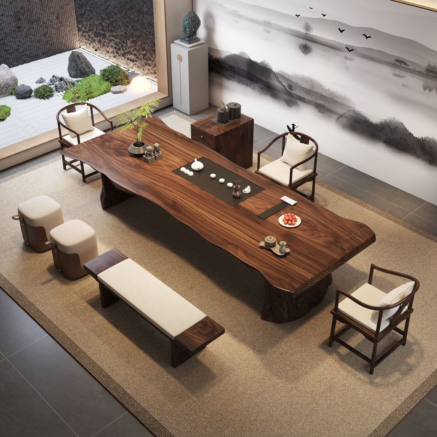 3.0 m south america walnut tea table + round-backed armchair * 3 + crescent stool * 2+1.4 m bench + limited time gift elegant tea cabinet