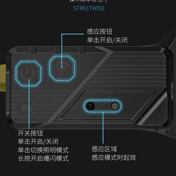 | Features | Multifunctional glasses light with switchable low and high beam, sensor-based. |
