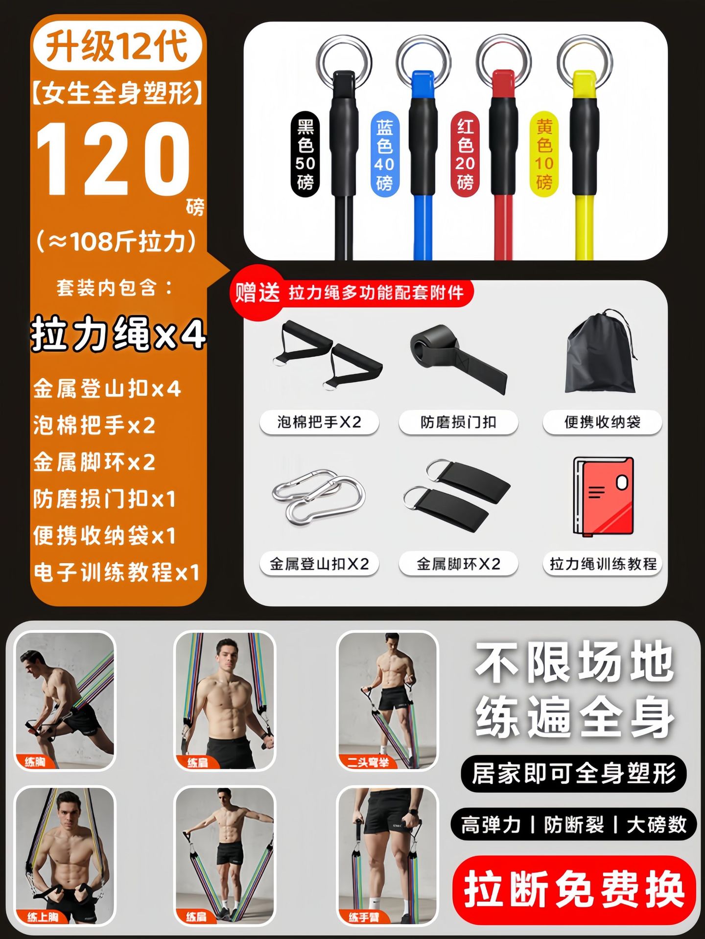 [4 ropes/about 120 pounds of tension] multi-functional supporting accessories and training tutorials are provided