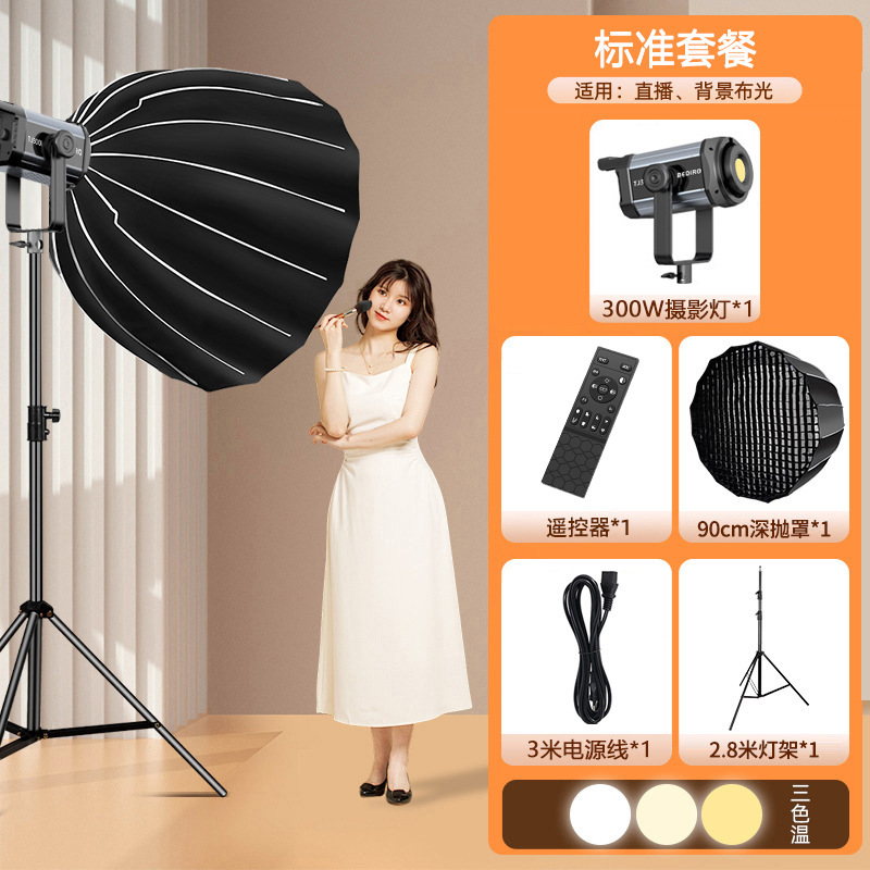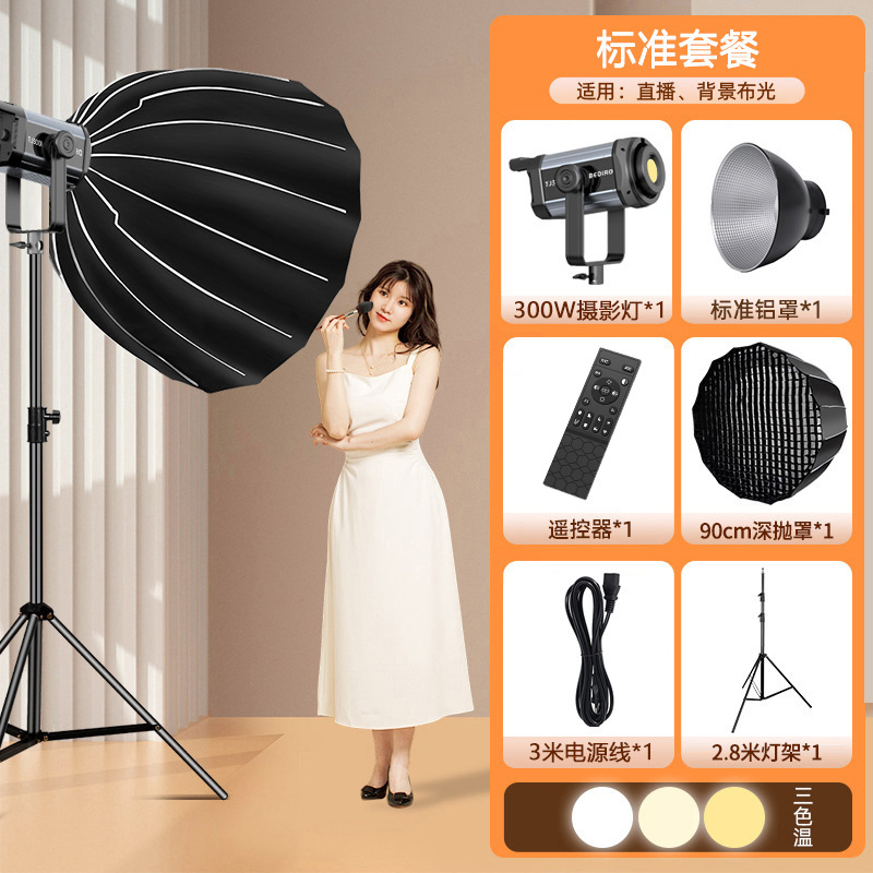 300w light (standard configuration) + 90cm deep parabolic reflector * 1 + 2.8-meter stand