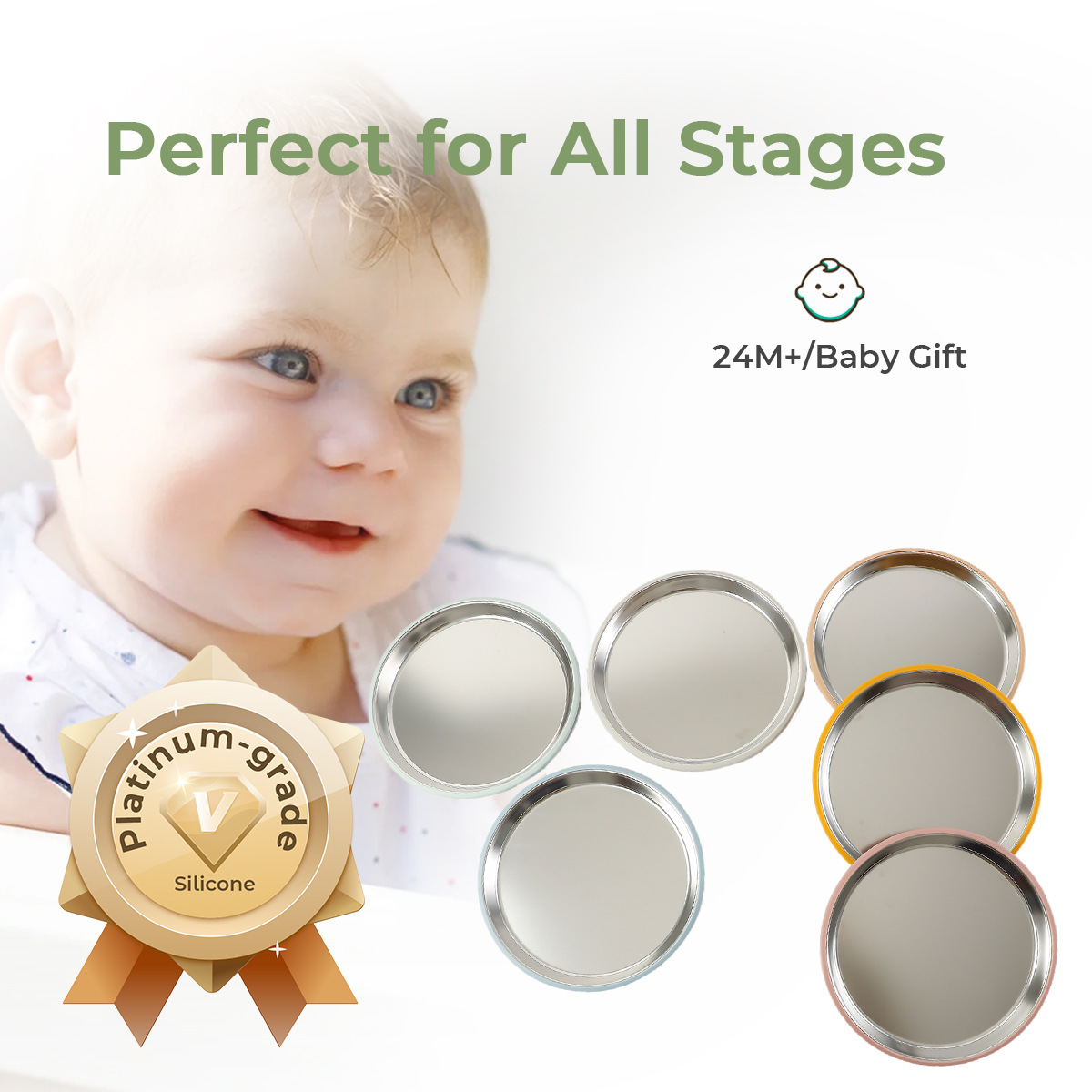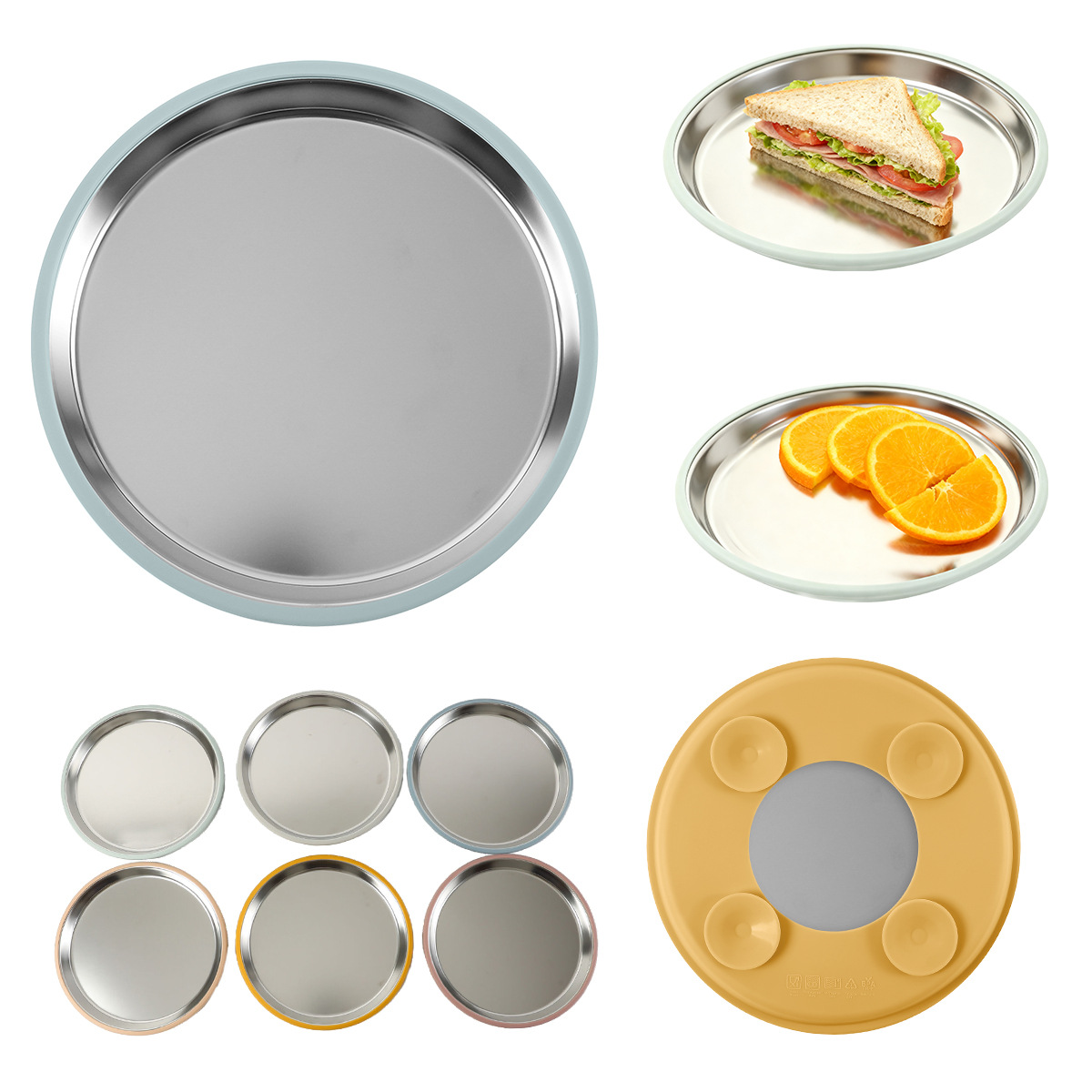 cross-border hot selling stainless steel plate silicone non-slip suction cup cover no compartment insulation children feeding tableware food tray