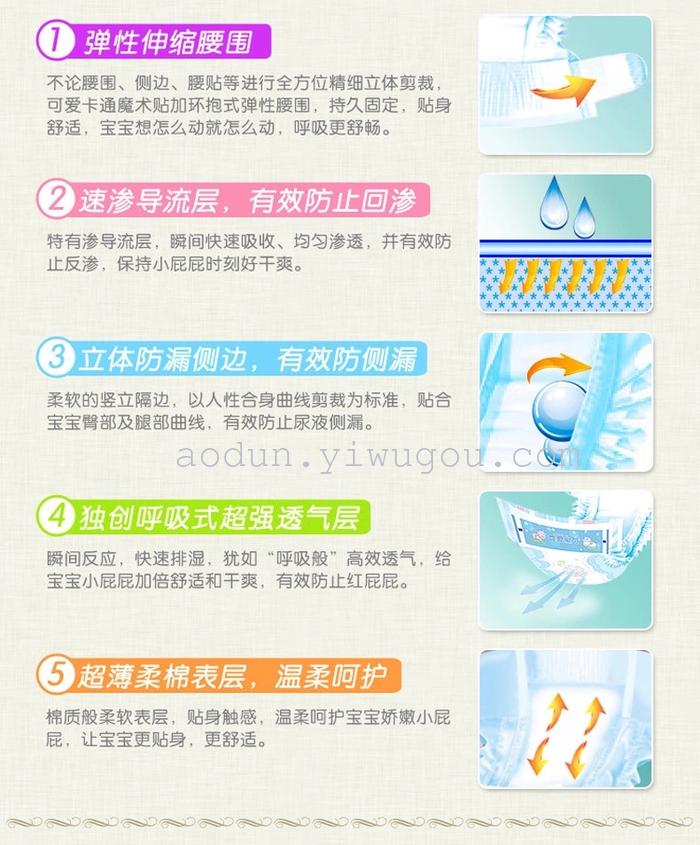Second, thematerial: imported wood pulp, imported polymer, non-woven, cast film, Velcro, PP stickers, composite film, pE film.