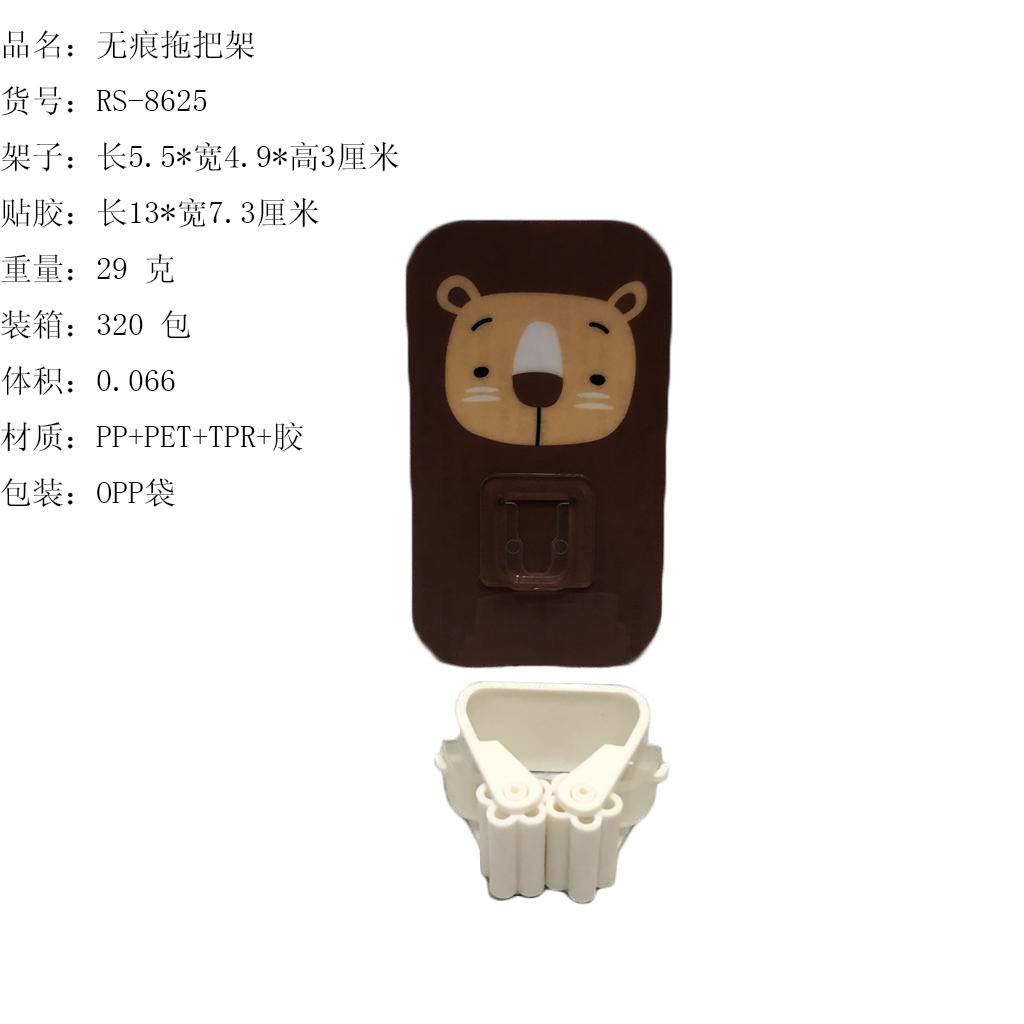产品介绍 可移动卡通印花无痕拖把架/粘胶壁挂扫把拖把夹采用优质的PP+橡胶材质制作而成,材料不含双酚A(BPA free)背面无痕粘勾可反复使用,寿命长,不伤墙面,可爱的卡通设计,清新宜家,简约时尚。无痕拖把架可以满足个性化需求,可挂各种拖把或扫把等,可以挂在墙上、门后等地方,可以强劲的吸附在瓷砖,镜子等光滑表面哦。产品可随意移动粘挂,墙面不留痕迹。适用于各种平滑表面厨房挂物、卫浴、卧室,贴着后完全防水、防油、防尘、可用清洁剂冲洗。适合家庭厨房、浴室、卧室等地方的任何坚硬光滑表面。