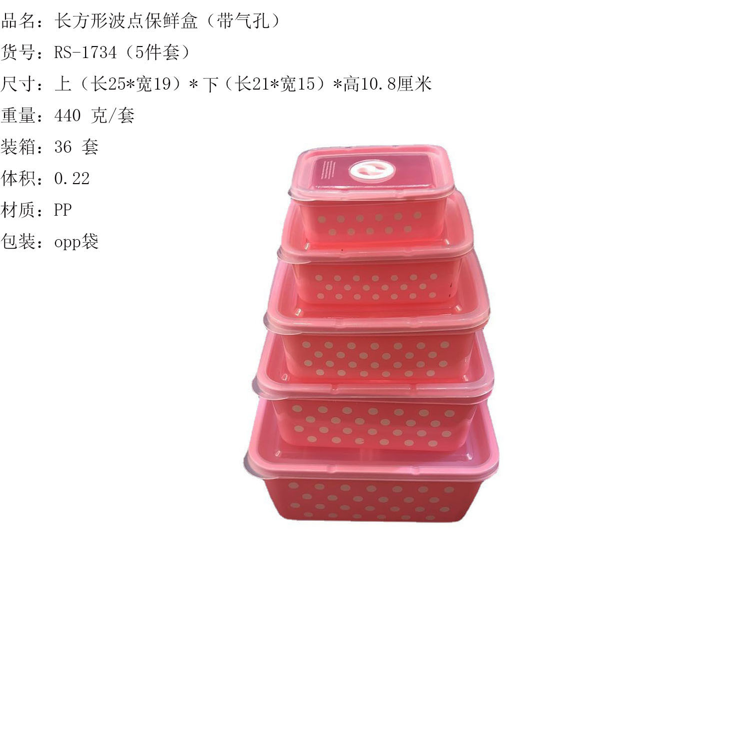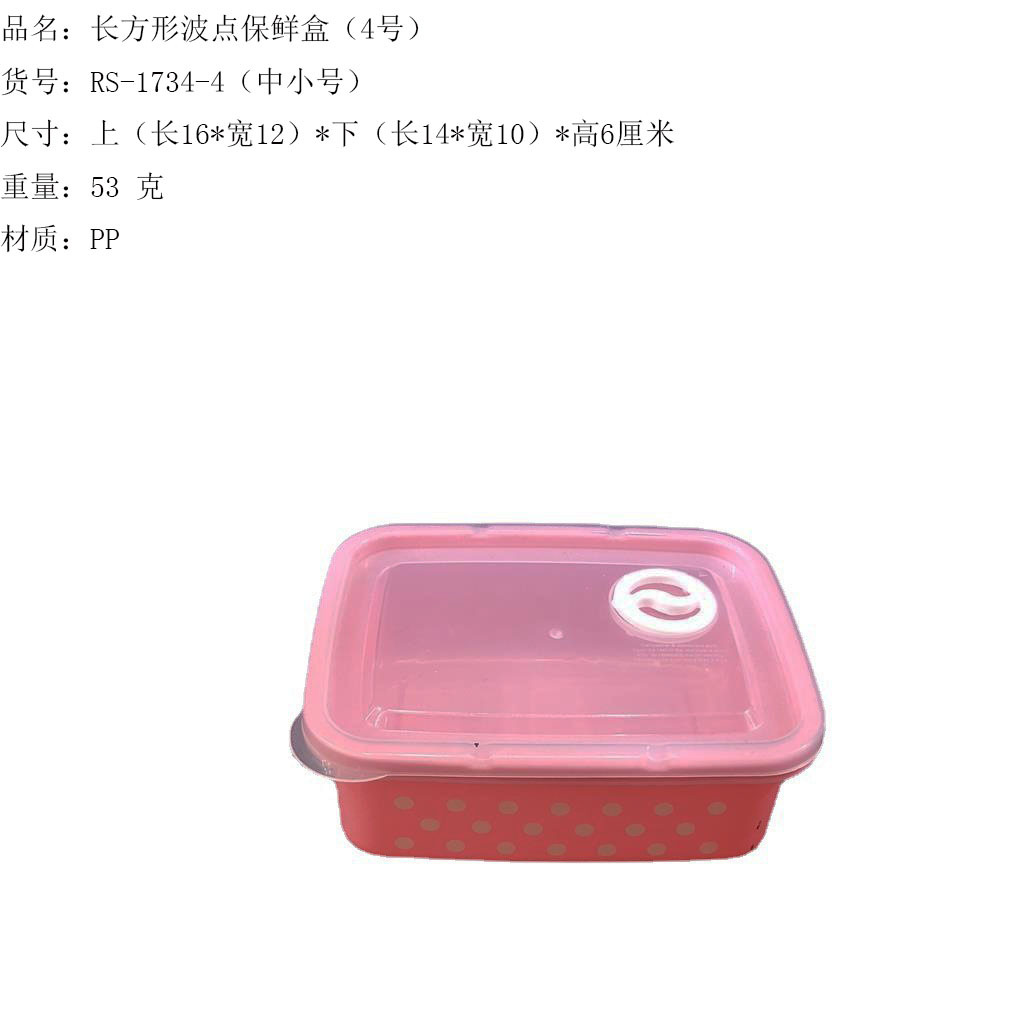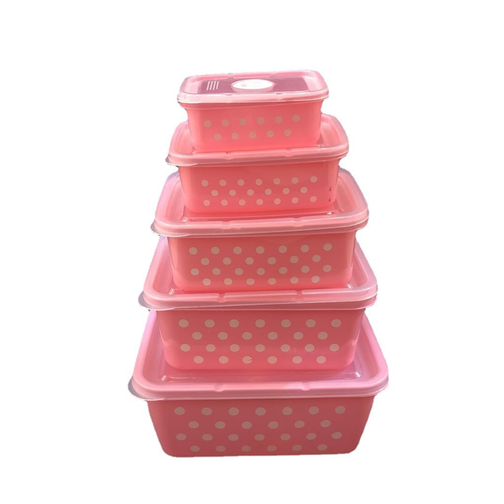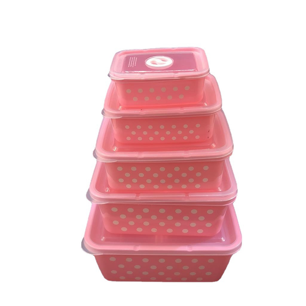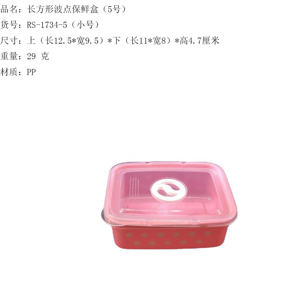 产品介绍 实色带气孔长方形波点保鲜盒5件套/广告礼品收纳保鲜盒套装采用优质食品级PP材质制作而成,材料不含双酚A(BPA free)保鲜盒可耐高温达120度,耐低温零下20度等特点。用于食物、水果、干湿货和休闲食品等收纳储存。其耐热、卫生,不易碎的特点也可用于微波炉、洗碗机、冰箱冷藏室及冷冻室,加热中不会释放有毒成分。适用于装放各种食物便于储藏和携带,是理想的居家生活用品。保鲜盒是可以放微波炉里加热(拧转出气孔),让你随时随地吃到热饭热菜哦。保鲜盒有一定的密封性可以保证食物的隔离放置,防止串味,防止食物受污,隔绝与外界的联系,有效地延长食物的保鲜期。是您工作、办公、上学、上班、户外旅游野餐等的好帮手。