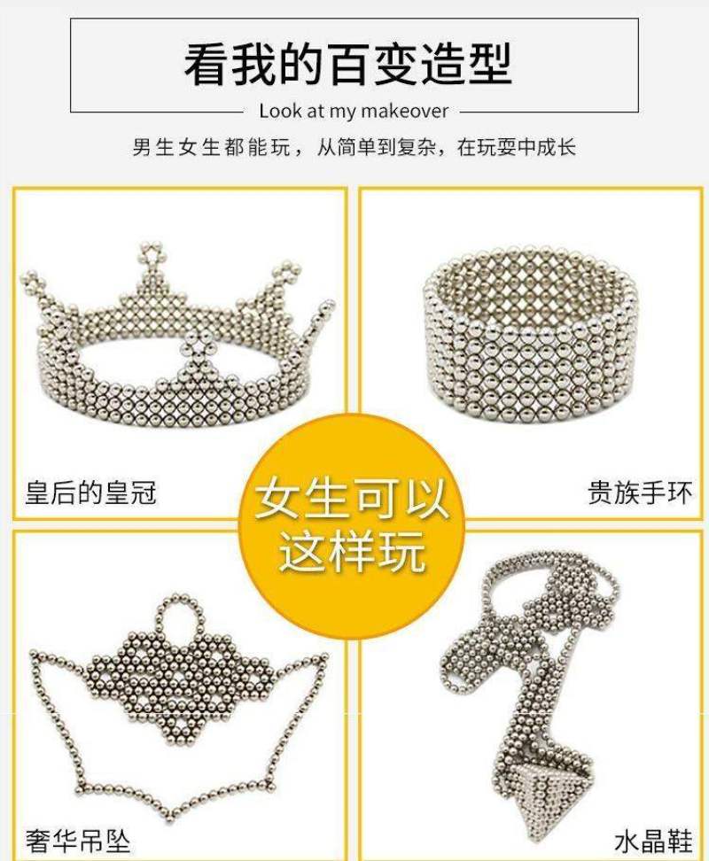 It is made of ndfeb permanent magnet, which is magnetic in all directions of the magnetic ball. It is easy to shape into various models or crafts. The most direct is to make a few beautiful bracelet.