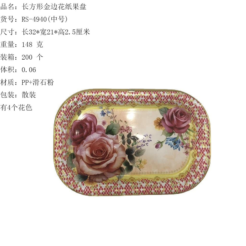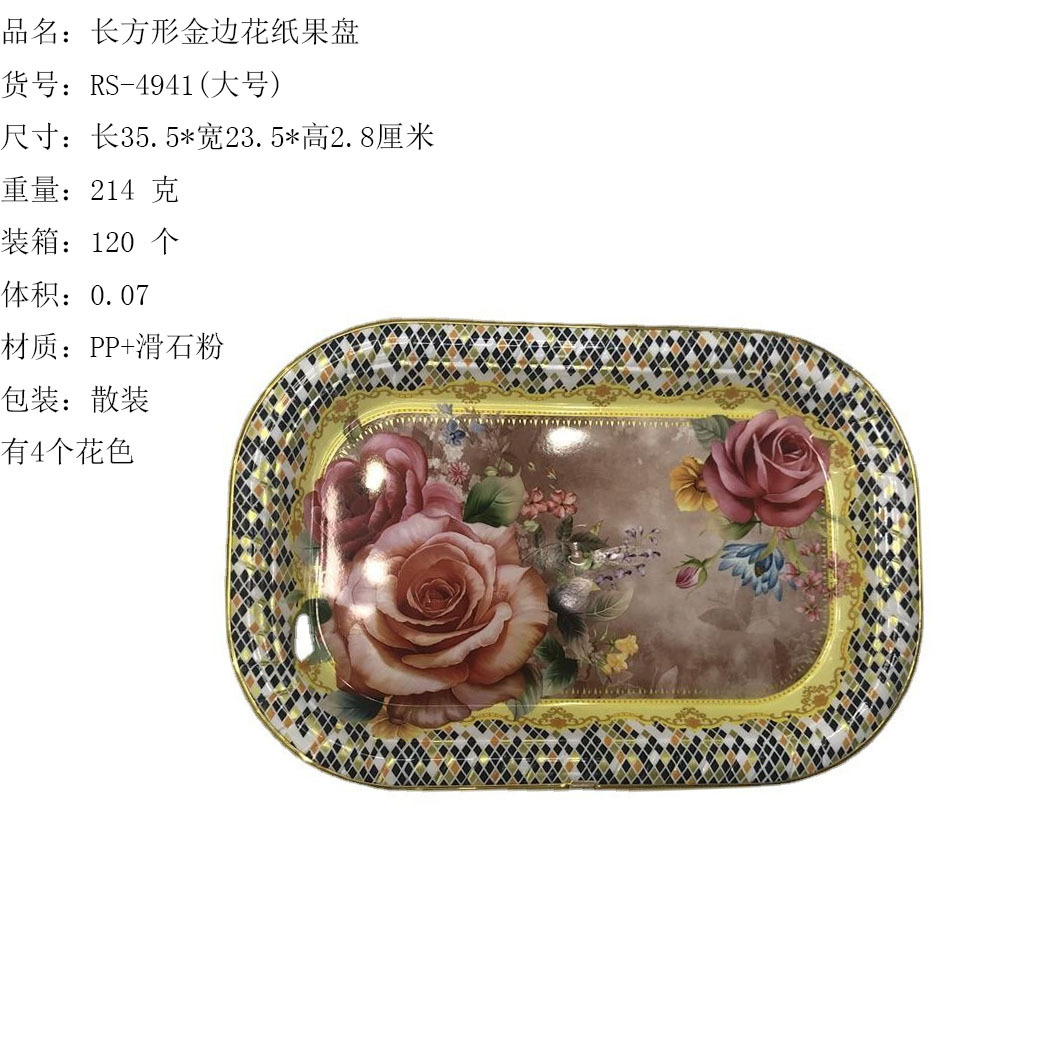 产品介绍 新款长方形金边果盘/2022新款果盘/包边花纸盘采用优质的PP材质+各种图案的花纸制作而成,材料不含双酚A(BPA free)不怕摔,款式简洁大方,外型色泽前卫时尚。强度高,硬度好,光泽好,手感圆润光滑,抗老化,寿命长,灰尘油污容易清洁,耐垢性好,低温下使用能保持相当好的韧性,经久耐用,方便收纳,果盘边缘包了一圈金色的包边,瞬间让花纸盘提升一个档次,看上去更加高大尚。果盘可用于盛放瓜果蔬菜或瓜子花生小零食等各种小食品,非常实用哦,是您居家的好伙伴,是家庭聚会/全家出外野餐/西点面包房摆盘等的选择。